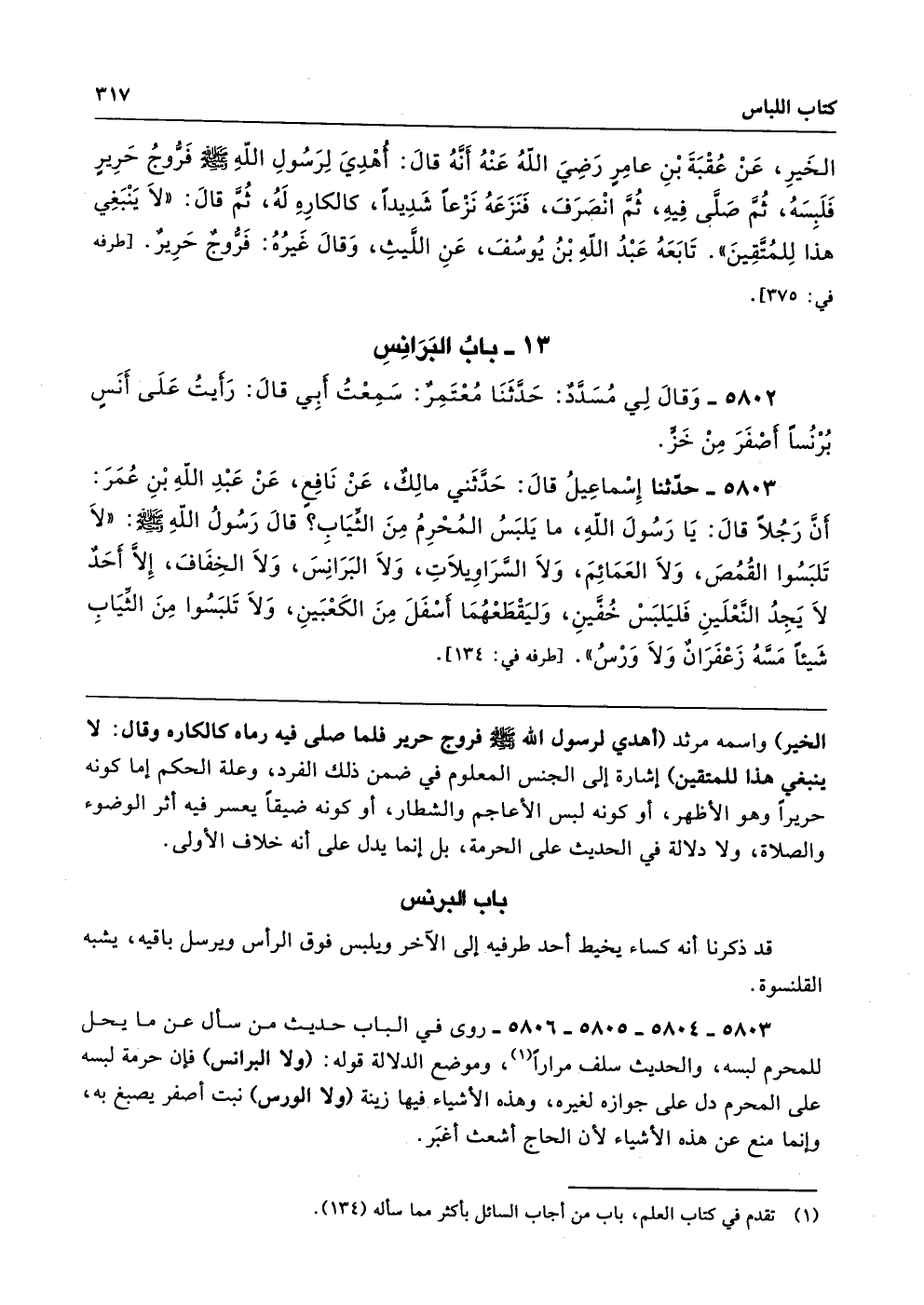 5803 - 5804 - 5805 - 5806 - روى في الباب حديث من سأل عن ما يحل للمحرم لبسه، والحديث سلف مرارًا، وموضع الدلالة قوله: (ولا البرانس) فإن حرمة لبسه على المحرم دل على جوازه لغيره، وهذه الأشياء فيها زينة (ولا الورس) نبت أصفر يصبغ به، وإنما منع عن هذه الأشياء لأن الحاج أشعث أغبَر.