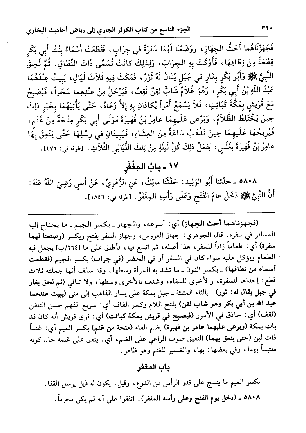 (فجهزناهما أحث الجهاز) أي: أسرعه، والجهاز -بكسر الجيم- ما يحتاج إليه المسافر في سفره. قال الجوهري: جهاز العروس، وجهاز السفر يفتح ويكسر (وصنعنا لهما سفرة) أي: طعامًا زادًا للسفر، هذا أصله، ثم اتسع فيه، فأطلق على ما يجعل فيه الطعام ويؤكل عليه سواء كان في السفر أو في الحضر (في جراب) بكسر الجيم (فقطعت أسماء من نطاقها) -بكسر النون- ما تشد به المرأة وسطها، وقد سلف أنها جعلته ثلاث قطع: إحداها للسفرة، والأخرى للسقاء، وشدت بالأخرى وسطها، ولا تنافي (ثم لحق بغار في جبل يقال له: ثور) -بالثاء المثلثة- جبل بمكة على يسار الذاهب إلى منى (يبيت عندهما عبد الله بن أبي بكر وهو شاب لقن) بفتح اللام وكسر القاف أي: سريع الفهم حسن التلقن (ثقف) أي: حاذق في الأمور (فيصبح في قريش بمكة كبائت) أي: ترى قريش أنَّه كان قد بات بمكة (ويرعى عليهما عامر بن فهيرة) بضم الفاء (منحة من غنم) بكسر الميم أي: غنمًا ذات لبن (حتَّى ينعق بهما) النعيق صوت الراعي على الغنم، أي: ينعق على غنمه حال كونه ملتبسًا بهما، وفي بعضها: بها، والضمير للغنم وهو ظاهر.