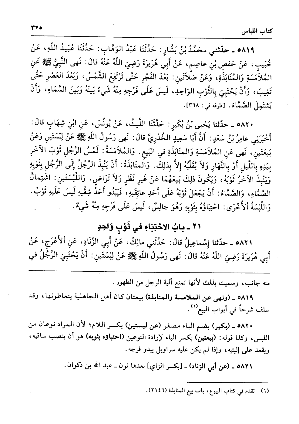 5820 - (بكير) بضم الباء مصغر (عن لبستين) بكسر اللام؛ لأن المراد نوعان من اللبس، وكذا قوله: (بيعتين) بكسر الباء لإرادة النوعين (احتباؤه بثوبه) هو أن ينصب ساقيه، ويقعد على إليتيه، وإذا لم يكن عليه سراويل يبدو فرجه.