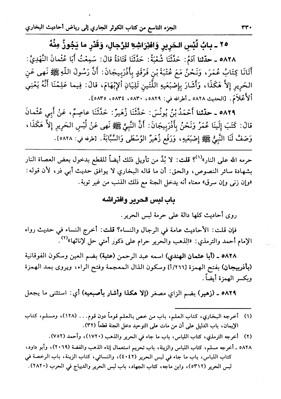 5829 - حَدَّثَنَا أَحْمَدُ بْنُ يُونُسَ حَدَّثَنَا زُهَيْرٌ حَدَّثَنَا عَاصِمٌ عَنْ أَبِى عُثْمَانَ قَالَ كَتَبَ إِلَيْنَا عُمَرُ وَنَحْنُ بِأَذْرَبِيجَانَ أَنَّ النَّبِىَّ - صلى الله عليه وسلم - نَهَى عَنْ لُبْسِ الْحَرِيرِ إِلاَّ هَكَذَا، وَصَفَّ لَنَا النَّبِىُّ - صلى الله عليه وسلم - إِصْبَعَيْهِ. وَرَفَعَ زُهَيْرٌ الْوُسْطَى وَالسَّبَّابَةَ. طرفه 5828