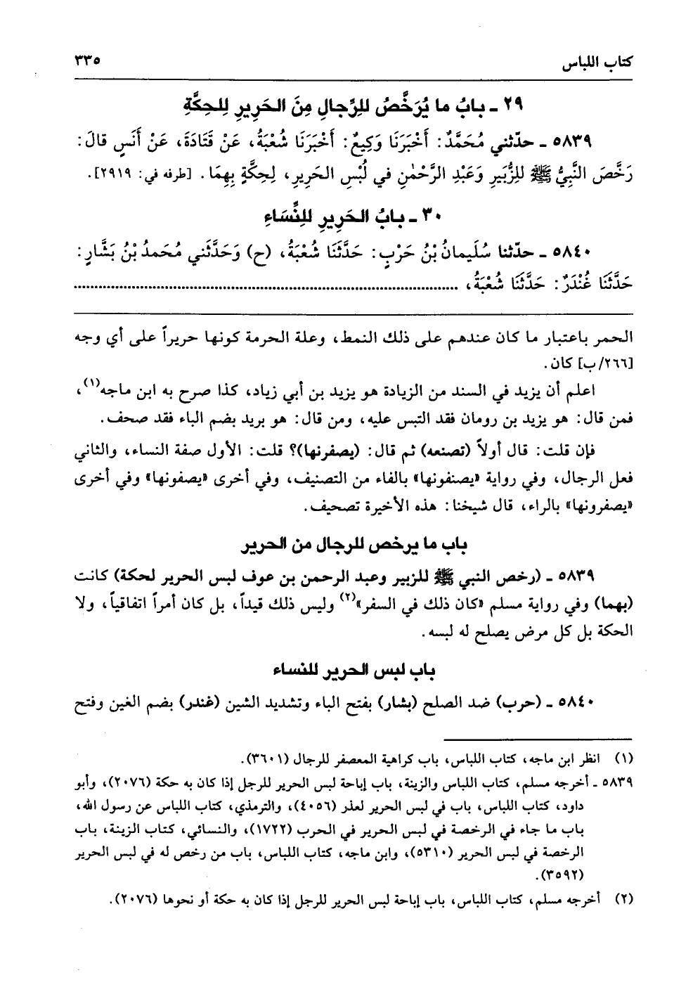 5839 - (رخص النبي - صلى الله عليه وسلم - للزبير وعبد الرحمن بن عوف لبس الحرير لحكة) كانت (بهما) وفي رواية مسلم "كان ذلك في السفر" وليس ذلك قيدًا، بل كان أمرًا اتفاقيًّا، ولا الحكة بل كل مرض يصلح له لبسه.
