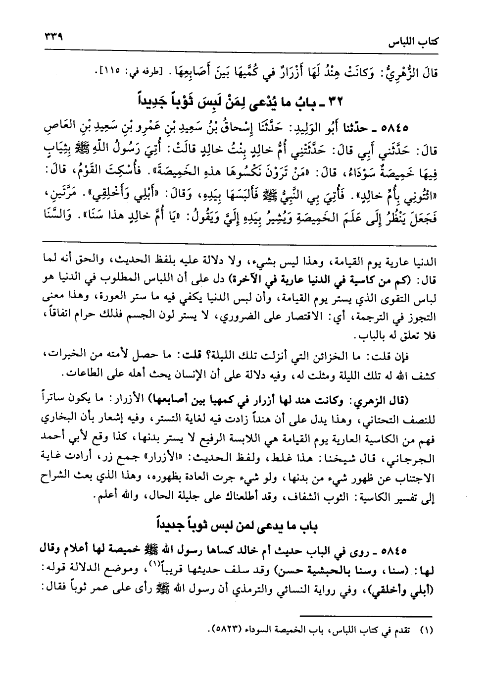 5845 - روى في الباب حديث أم خالد كساها رسول الله - صلى الله عليه وسلم - خميصة لها أعلام وقال لها: (سنا، وسنا بالحبشية حسن) وقد سلف حديثها قريبًا، وموضع الدلالة قوله: (أبلي وأخلقي)، وفي رواية النسائي والترمذي أن رسول الله - صلى الله عليه وسلم - رأى على عمر ثوبًا فقال:
