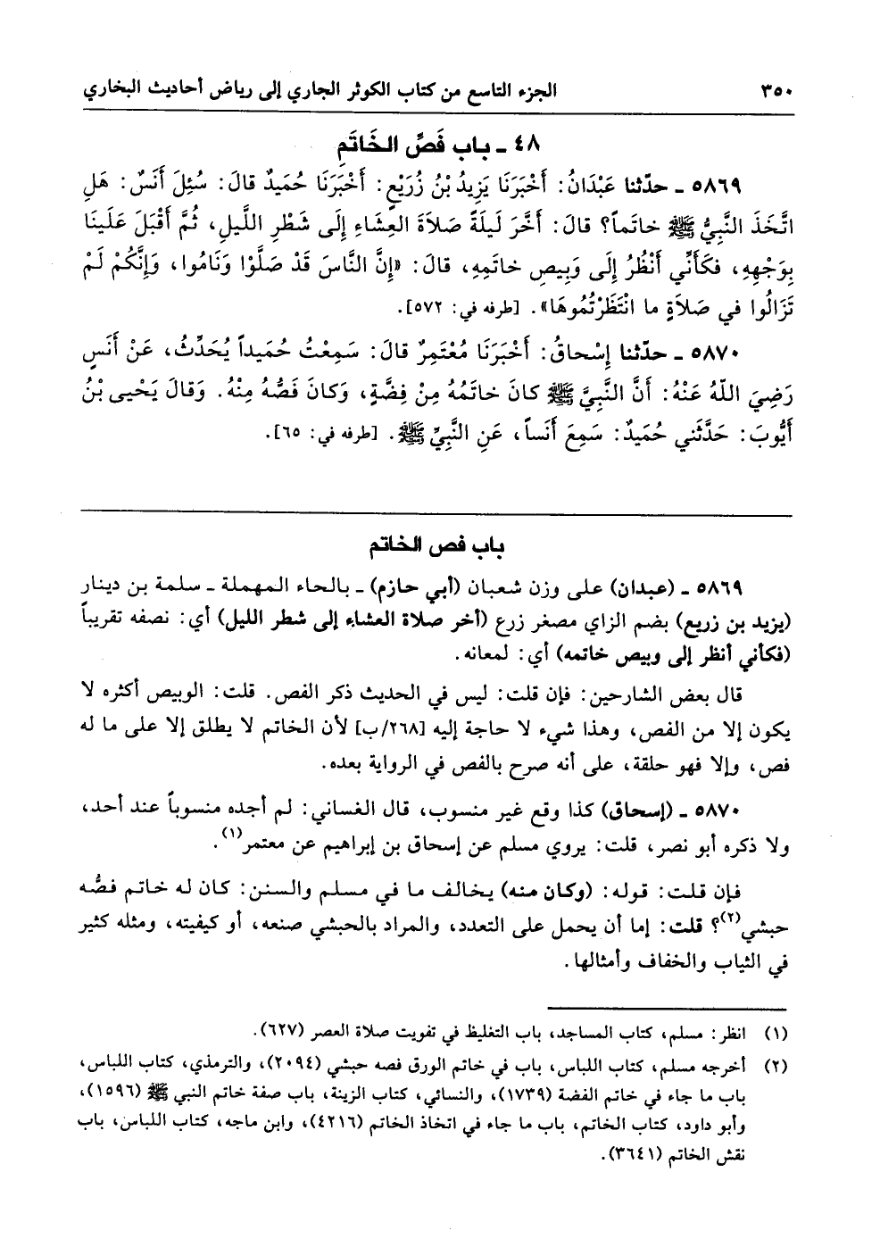 5869 - (عبدان) على وزن شعبان (أبي حازم) -بالحاء المهملة- سلمة بن دينار (يزيد بن زريع) بضم الزاي مصغر زرع (آخر صلاة العشاء إلى شطر الليل) أي: نصفه تقريبًا (فكأني أنظر إلى وبيص خاتمه) أي: لمعانه.