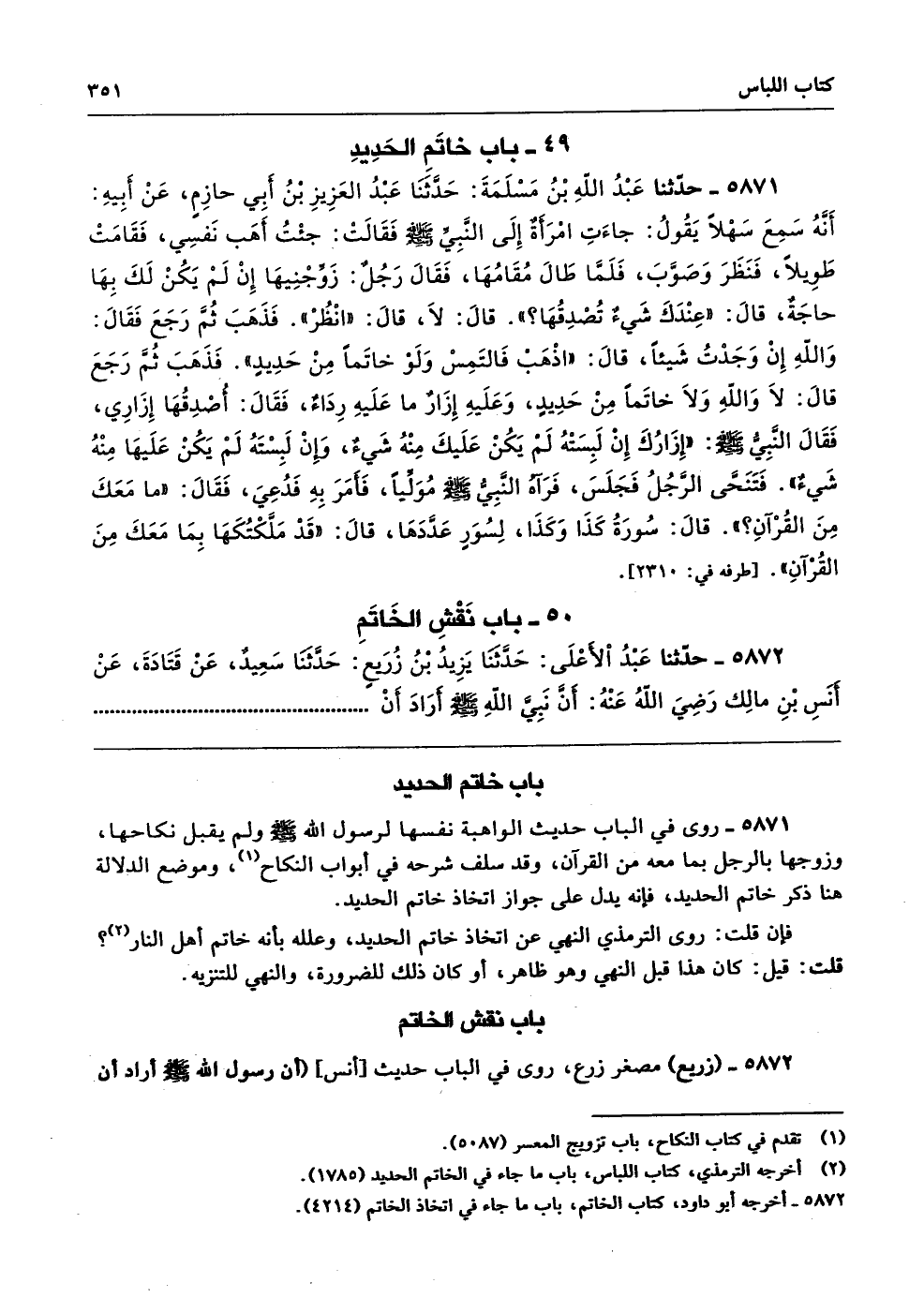 5871 - روى في الباب حديث الواهبة نفسها لرسول الله - صلى الله عليه وسلم - ولم يقبل نكاحها، وزوجها بالرجل بما معه من القرآن، وقد سلف شرحه في أبواب النِّكَاح، وموضع الدلالة هنا ذكر خاتم الحديد، فإنه يدل على جواز اتخاذ خاتم الحديد.