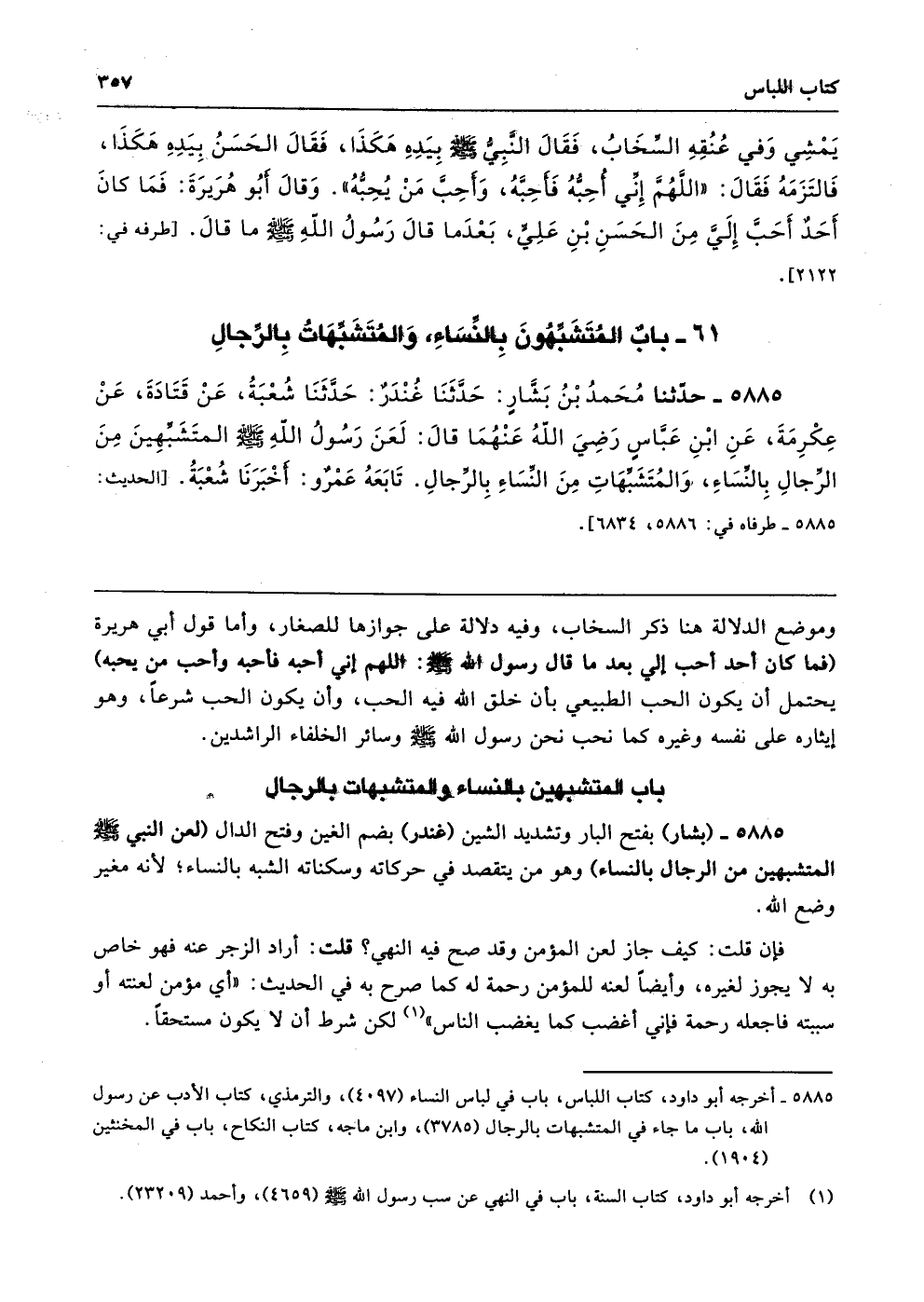 5885 - (بشار) بفتح البار وتشديد الشين (غندر) بضم الغين وفتح الدال (لعن النبي - صلى الله عليه وسلم - المتشبهين من الرجال بالنساء) وهو من يتقصد في حركاته وسكناته الشبه بالنساء؛ لأنه مغير وضع الله.