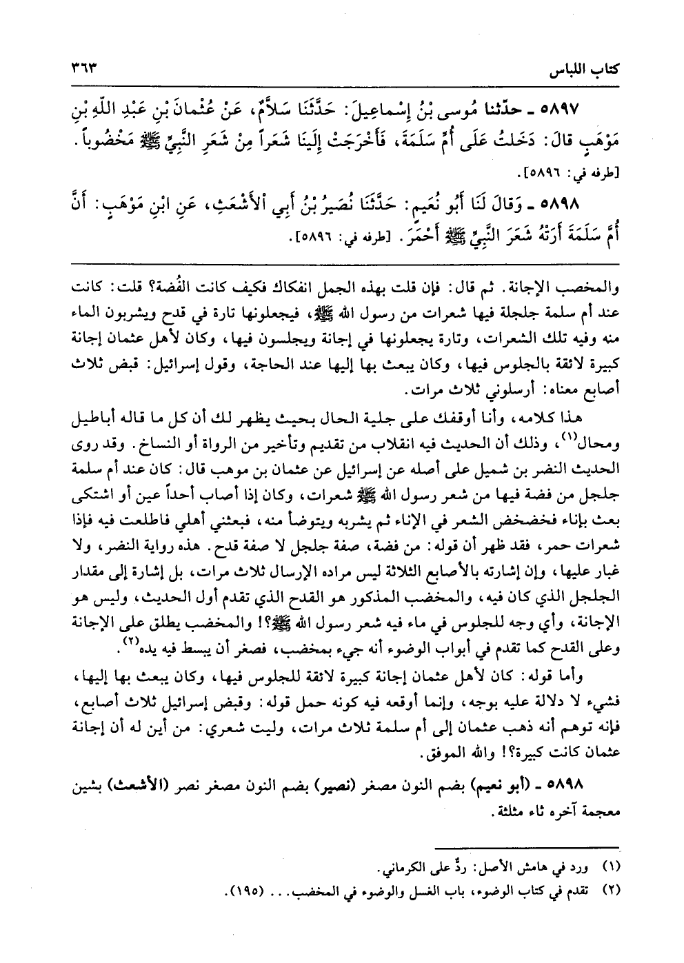 5897 - حَدَّثَنَا مُوسَى بْنُ إِسْمَاعِيلَ حَدَّثَنَا سَلاَّمٌ عَنْ عُثْمَانَ بْنِ عَبْدِ اللَّهِ بْنِ مَوْهَبٍ قَالَ دَخَلْتُ عَلَى أُمِّ سَلَمَةَ فَأَخْرَجَتْ إِلَيْنَا شَعَرًا مِنْ شَعَرِ النَّبِيِّ - صلى الله عليه وسلم - مَخْضُوبًا. طرفه 5896