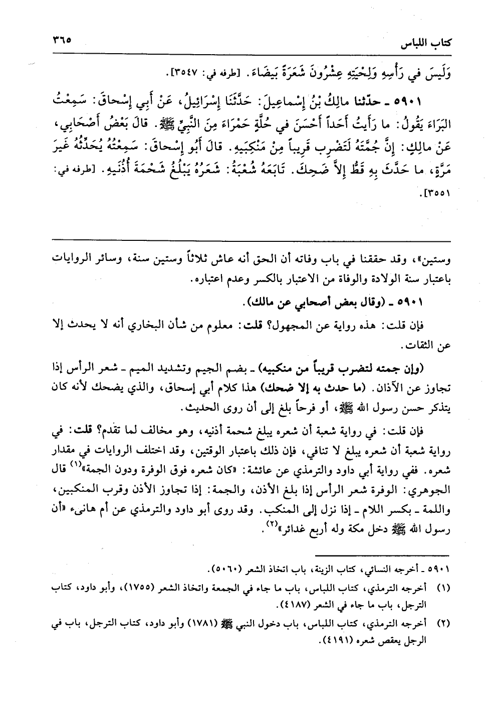 5901 - حَدَّثَنَا مَالِكُ بْنُ إِسْمَاعِيلَ حَدَّثَنَا إِسْرَائِيلُ عَنْ أَبِى إِسْحَاقَ سَمِعْتُ الْبَرَاءَ يَقُولُ مَا رَأَيْتُ أَحَدًا أَحْسَنَ فِي حُلَّةٍ حَمْرَاءَ مِنَ النَّبِيِّ - صلى الله عليه وسلم -. قَالَ بَعْضُ أَصْحَابِى عَنْ مَالِكٍ إِنَّ جُمَّتَهُ لَتَضْرِبُ قَرِيبًا مِنْ مَنْكِبَيْهِ. قَالَ أَبُو إِسْحَاقَ سَمِعْتُهُ يُحَدِّثُهُ غَيْرَ مَرَّةٍ، مَا حَدَّثَ بِهِ قَطُّ إِلاَّ ضَحِكَ. تَابَعَهُ شُعْبَةُ شَعَرُهُ يَبْلُغُ شَحْمَةَ أُذُنَيْهِ. طرفه 3551