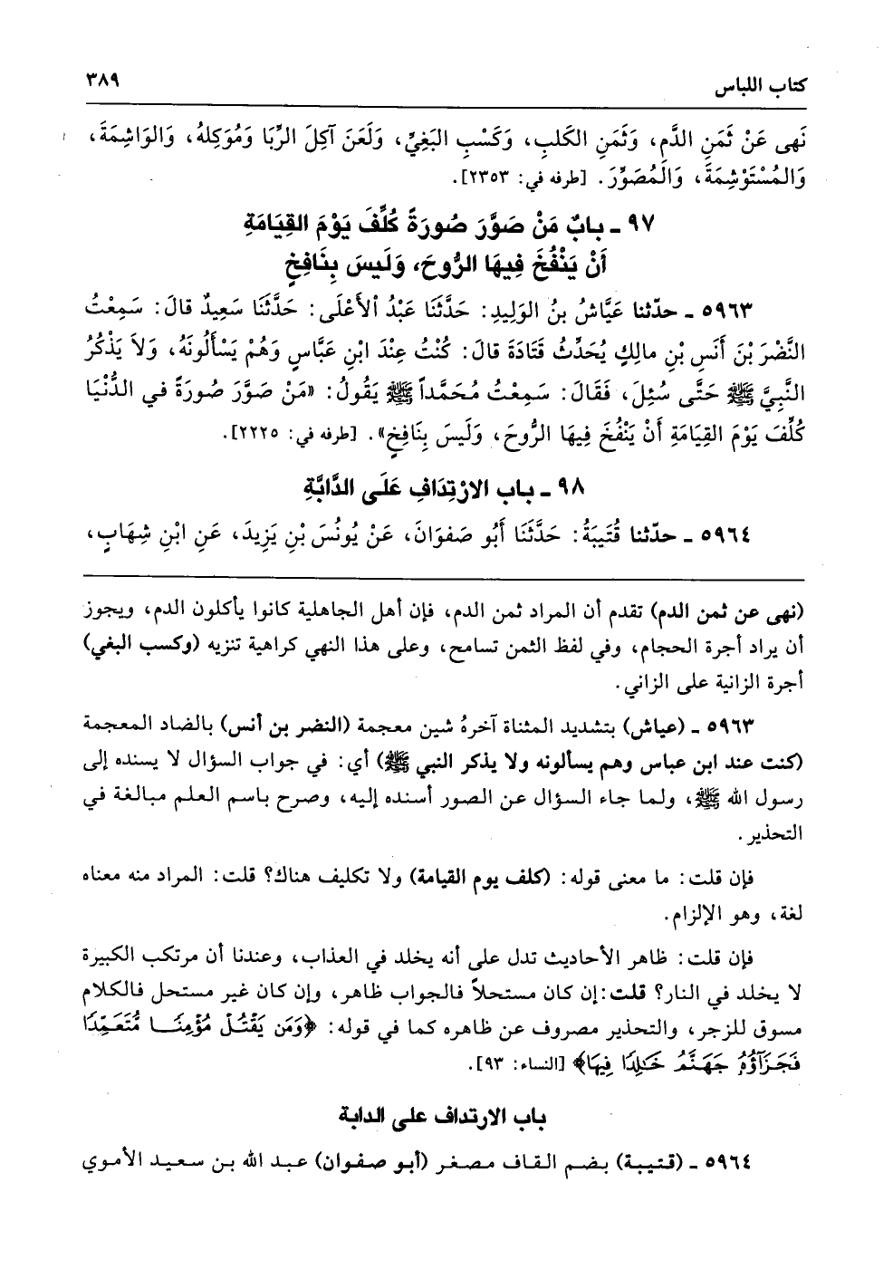 97 - باب مَنْ صَوَّرَ صُورَةً كُلِّفَ يَوْمَ الْقِيَامَةِ أَنْ يَنْفُخَ فِيهَا الرُّوحَ، وَلَيْسَ بِنَافِخٍ