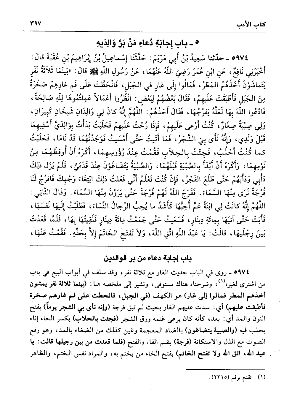 5974 - روى في الباب حديث الغار مع ثلاثة نفر، وقد سلف في أبواب البيع في باب من اشترى لغيره، وشرحناه هناك مستوفى، ونشير إلى ملخصه هنا: (بينما ثلاثة نفر يمشون أخذهم المطر فمالوا إلى غار) هو الكهف (في الجبل، فانحطت على فم غارهم صخرة فأطبقت عليهم) أي: سدت عليهم الغار بحيث لم تبق فرجة (وإنه نأى بي الشجر يومًا) بفتح النون والمد أي: بعد، كأنه كان يرعى غنمه ورق الشجر (فجئت بالحلاب) بكسر الحاء إناء يحلب فيه (والصبية يتضاغون) بالضاد المعجمة وغين كذلك من الضغاء بالمد، وهو رفع الصوت مع الذل والاستكانة (فرجة) بضم الفاء والفتح (فلما قعدت من بين رجيلها قالت: يا عبد الله، اتق الله ولا تفتح الخاتم) بفتح الخاء من يختم به، والمراد نفس الختم، والظاهر