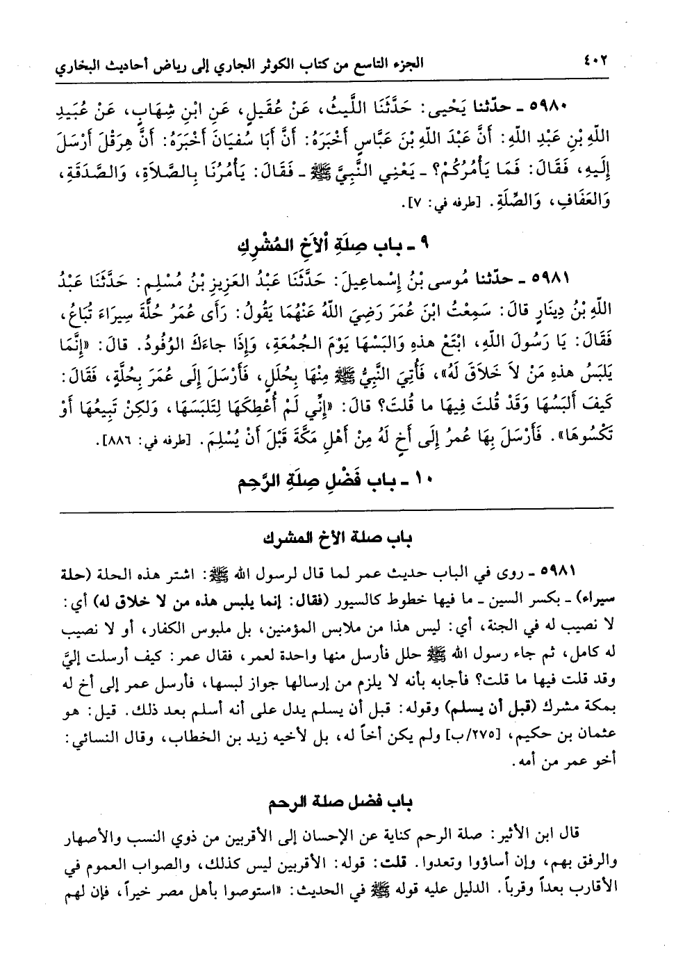 5981 - روى في الباب حديث عمر لما قال لرسول الله - صلى الله عليه وسلم -: اشتر هذه الحلة (حلة سيراء) -بكسر السين- ما فيها خطوط كالسيور (فقال: إنما يلبس هذه من لا خلاق له) أي: لا نصيب له في الجنة، أي: ليس هذا من ملابس المؤمنين، بل ملبوس الكفار، أو لا نصيب له كامل، ثم جاء رسول الله - صلى الله عليه وسلم - حلل فأرسل منها واحدة لعمر، فقال عمر: كيف أرسلت إليَّ وقد قلت فيها ما قلت؟ فأجابه بأنه لا يلزم من إرسالها جواز لبسها، فأرسل عمر إلى أخ له بمكة مشرك (قبل أن يسلم) وقوله: قبل أن يسلم يدل على أنه أسلم بعد ذلك. قيل: هو عثمان بن حكيم، ولم يكن أخًا له، بل لأخيه زيد بن الخطاب، وقال النسائي: أخو عمر من أمه.