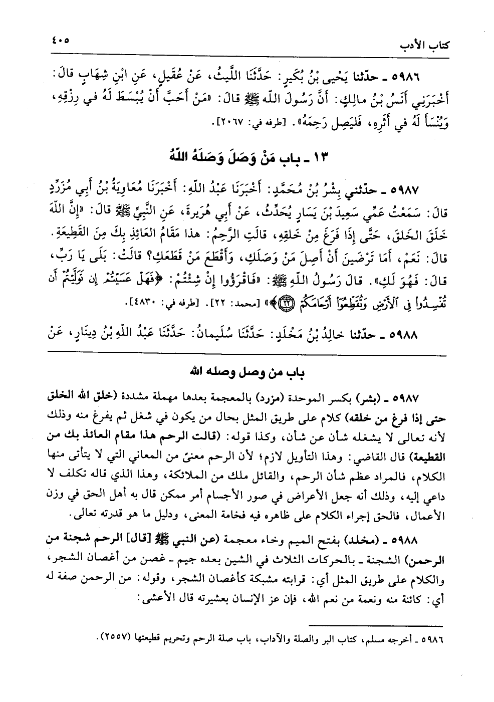5987 - (بشر) بكسر الموحدة (مزرد) بالمعجمة بعدها مهملة مشددة (خلق الله الخلق حتى إذا فرغ من خلقه) كلام على طريق المثل بحال من يكون في شغل ثم يفرغ منه وذلك لأنه تعالى لا يشغله شأن عن شأن، وكذا قوله: (قالت الرحم هذا مقام العائذ بك من القطيعة) قال القاضي: وهذا التأويل لازم؛ لأن الرحم معنى من المعاني التي لا يتأتى منها الكلام، فالمراد عظم شأن الرحم، والقائل ملك من الملائكة، وهذا الذي قاله تكلف لا داعي إليه، وذلك أنه جعل الأعراض في صور الأجسام أمر ممكن قال به أهل الحق في وزن الأعمال، فالحق إجراء الكلام على ظاهره فيه فخامة المعنى، ودليل ما هو قدرته تعالى.