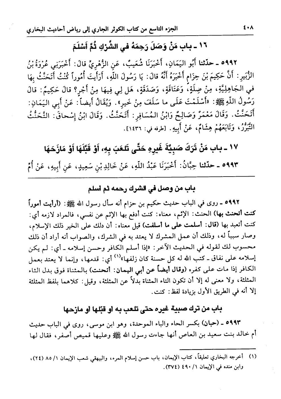 5992 - روى في الباب حديث حكيم بن حزام أنه سأل رسول الله - صلى الله عليه وسلم -: (أرأيت أمورًا كنت أتحنث بها) الحنث: الإثم، معناه: كنت أدفع بها الإثم عن نفسي، فالمراد لازمه أي: كنت أتعبد بها (قال: أسلمت على ما أسلفت) قيل معناه: أن دلك على الخير ذلك الإسلام، وصار سببًا له، وذلك أن عمل المشرك لا يعتد به في الشرك، والصواب أنه أراد أن ذلك محسوب لك لقوله في الحديث الآخر: "إذا أسلم الكافر وحسن إسلامه -أي: لم يكن إسلامه على نفاق- كتب الله له كل حسنة كان زلفها" أي: قدمها، وإنما لا يعتد بعمل الكافر إذا مات على كفره (وقال أيضًا عن أبي اليمان: أتحنث) بالمثناة فوق بدل الثاء المثلثة، ولا معنى له إلا أن تكون التاء المثناة بدلًا عن المثلثة، وقيل: كلاهما بلفظ المثلثة إلا أنه في الطريق الأول بزيادة لفظ: كنت.