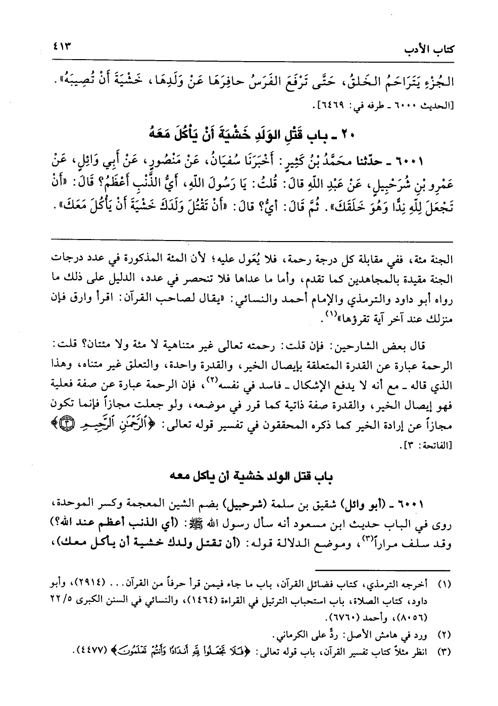 6001 - حَدَّثَنَا مُحَمَّدُ بْنُ كَثِيرٍ أَخْبَرَنَا سُفْيَانُ عَنْ مَنْصُورٍ عَنْ أَبِى وَائِلٍ عَنْ عَمْرِو بْنِ شُرَحْبِيلَ عَنْ عَبْدِ اللَّهِ قَالَ قُلْتُ يَا رَسُولَ اللَّهِ أَىُّ الذَّنْبِ أَعْظَمُ قَالَ «أَنْ تَجْعَلَ لِلَّهِ نِدًّا وَهْوَ خَلَقَكَ». ثُمَّ قَالَ أَىُّ قَالَ «أَنْ تَقْتُلَ وَلَدَكَ خَشْيَةَ أَنْ يَأْكُلَ مَعَكَ».
