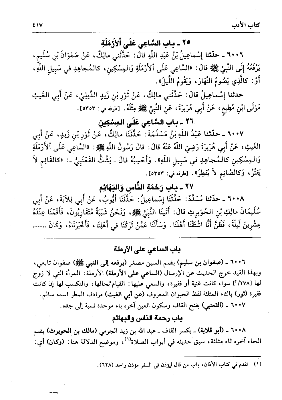 6006 - حَدَّثَنَا إِسْمَاعِيلُ بْنُ عَبْدِ اللَّهِ قَالَ حَدَّثَنِى مَالِكٌ عَنْ صَفْوَانَ بْنِ سُلَيْمٍ يَرْفَعُهُ إِلَى النَّبِيِّ - صلى الله عليه وسلم - قَالَ «السَّاعِى عَلَى الأَرْمَلَةِ وَالْمِسْكِينِ كَالْمُجَاهِدِ فِي سَبِيلِ اللَّهِ، أَوْ كَالَّذِى يَصُومُ النَّهَارَ وَيَقُومُ اللَّيْلَ».
