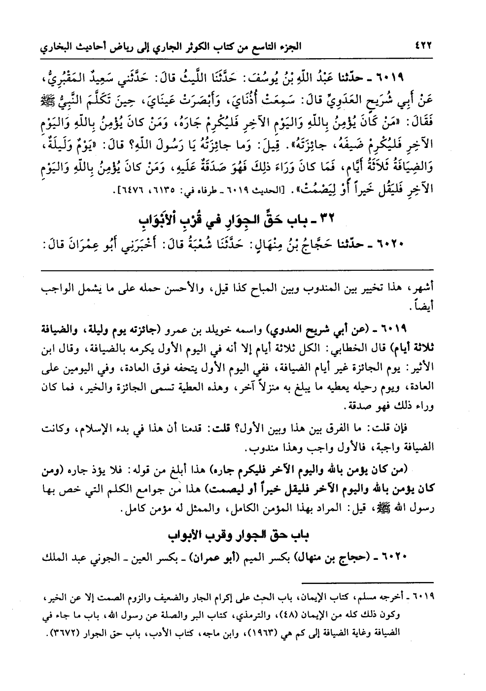 6019 - (عن أبي شريح العدوي) واسمه خويلد بن عمرو (جائزته يوم وليلة، والضيافة ثلاثة أيام) قال الخطابي: الكل ثلاثة أيام إلا أنه في اليوم الأول يكرمه بالضيافة، وقال ابن الأثير: يوم الجائزة غير أيام الضيافة، ففي اليوم الأول يتحفه فوق العادة، وفي اليومين على العادة، ويوم رحيله يعطيه ما يبلغ به منزلًا آخر، وهذه العطية تسمى الجائزة والخير، فما كان وراء ذلك فهو صدقة.