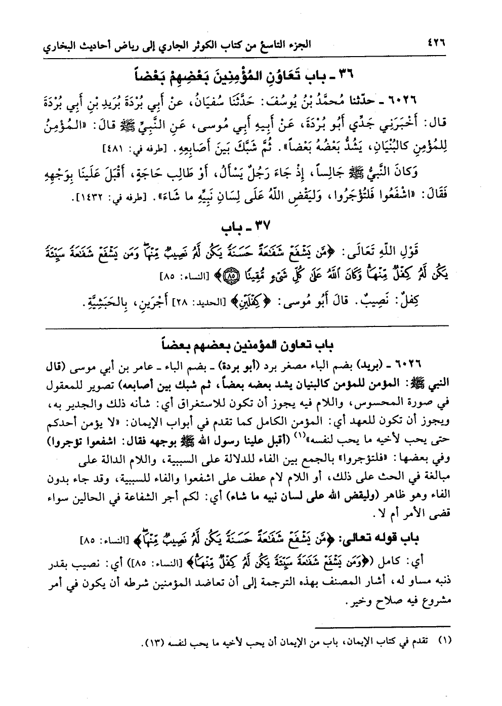 أي: كامل ({وَمَنْ يَشْفَعْ شَفَاعَةً سَيِّئَةً يَكُنْ لَهُ كِفْلٌ مِنْهَا (85)} [النساء: 85] أي: نصيب بقدر ذنبه مساو له، أشار المصنف بهذه الترجمة إلى أن تعاضد المؤمنين شرطه أن يكون في أمر مشروع فيه صلاح وخير.