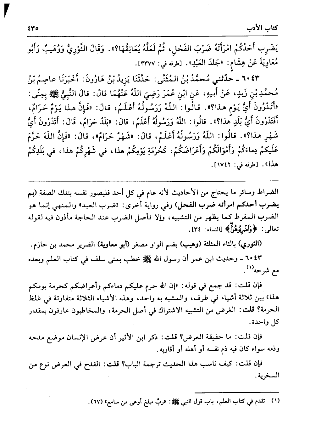 قَالُوا اللَّهُ وَرَسُولُهُ أَعْلَمُ. قَالَ «فَإِنَّ هَذَا يَوْمٌ حَرَامٌ، أَفَتَدْرُونَ أَىُّ بَلَدٍ هَذَا». قَالُوا اللَّهُ وَرَسُولُهُ أَعْلَمُ. قَالَ «بَلَدٌ حَرَامٌ، أَتَدْرُونَ أَىُّ شَهْرٍ هَذَا». قَالُوا اللَّهُ وَرَسُولُهُ أَعْلَمُ. قَالَ «شَهْرٌ حَرَامٌ». قَالَ «فَإِنَّ اللَّهَ حَرَّمَ عَلَيْكُمْ دِمَاءَكُمْ وَأَمْوَالَكُمْ وَأَعْرَاضَكُمْ، كَحُرْمَةِ يَوْمِكُمْ هَذَا فِي شَهْرِكُمْ هَذَا فِي بَلَدِكُمْ هَذَا». طرفه 1742