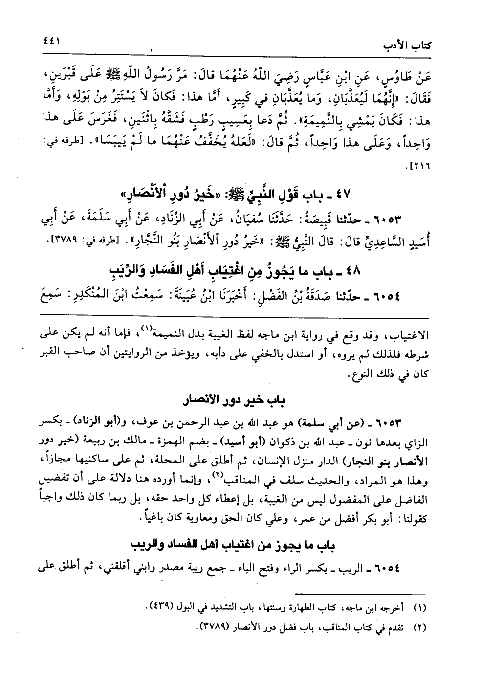 6053 - (عن أبي سلمة) هو عبد الله بن عبد الرحمن بن عوف، و (أبو الزناد) -بكسر الزاي بعدها نون- عبد الله بن ذكوان (أبو أسيد) -بضم الهمزة- مالك بن ربيعة (خير دور الأنصار بنو النجار) الدار منزل الإنسان، ثم أطلق على المحلة، ثم على ساكنيها مجازًا، وهذا هو المراد، والحديث سلف في المناقب , وإنما أورده هنا دلالة على أن تفضيل الفاضل على المفضول ليس من الغيبة، بل إعطاء كل واحد حقه، بل ربما كان ذلك واجبًا كقولنا: أبو بكر أفضل من عمر، وعلي كان الحق ومعاوية كان باغيًا.