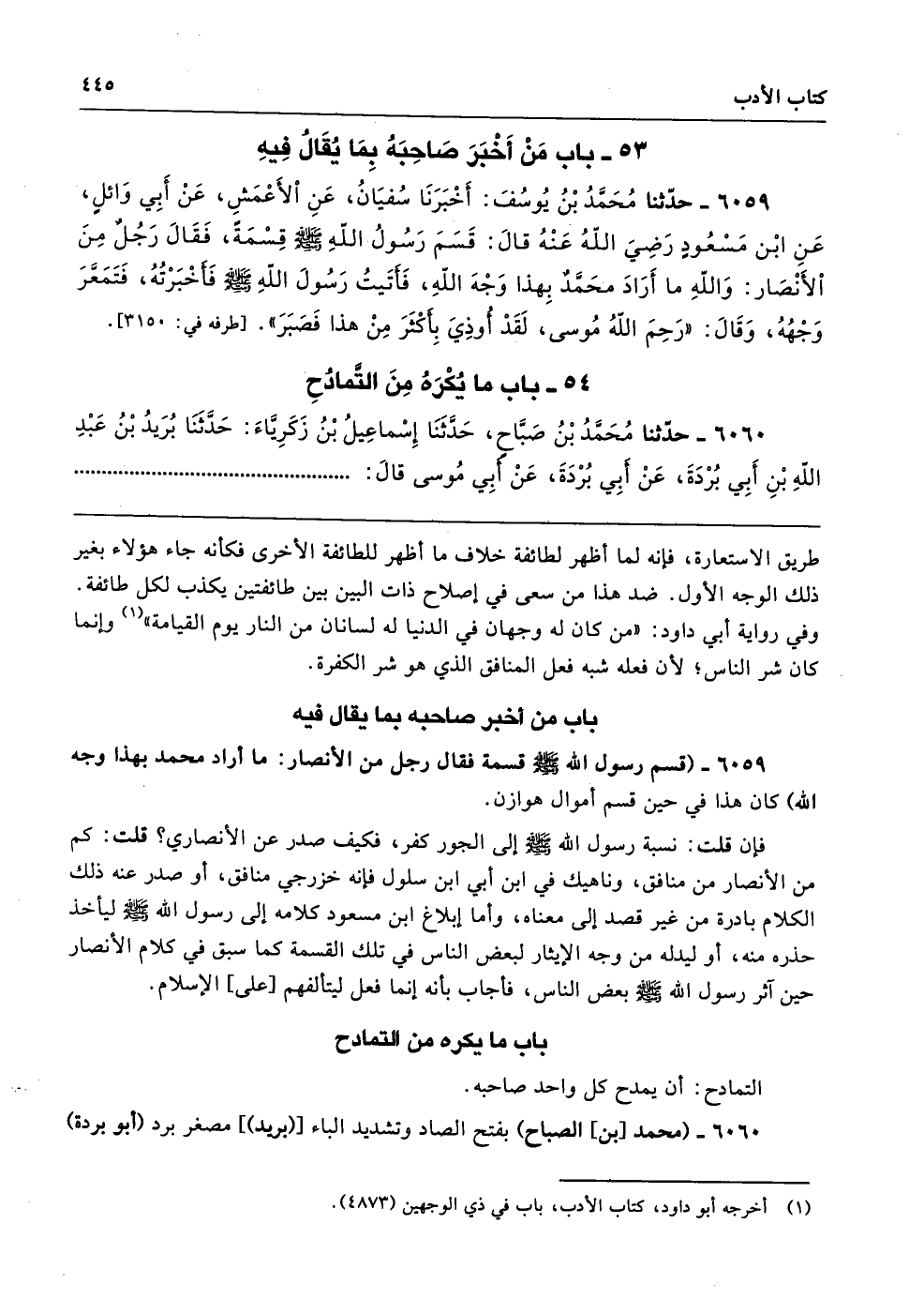6059 - حَدَّثَنَا مُحَمَّدُ بْنُ يُوسُفَ أَخْبَرَنَا سُفْيَانُ عَنِ الأَعْمَشِ عَنْ أَبِى وَائِلٍ عَنِ ابْنِ مَسْعُودٍ - رضى الله عنه - قَالَ قَسَمَ رَسُولُ اللَّهِ - صلى الله عليه وسلم - قِسْمَةً، فَقَالَ رَجُلٌ مِنَ الأَنْصَارِ وَاللَّهِ مَا أَرَادَ مُحَمَّدٌ بِهَذَا وَجْهَ اللَّهِ. فَأَتَيْتُ رَسُولَ اللَّهِ - صلى الله عليه وسلم - فَأَخْبَرْتُهُ، فَتَمَعَّرَ وَجْهُهُ وَقَالَ «رَحِمَ اللَّهُ مُوسَى، لَقَدْ أُوذِىَ بِأَكْثَرَ مِنْ هَذَا فَصَبَرَ». طرفه 3150