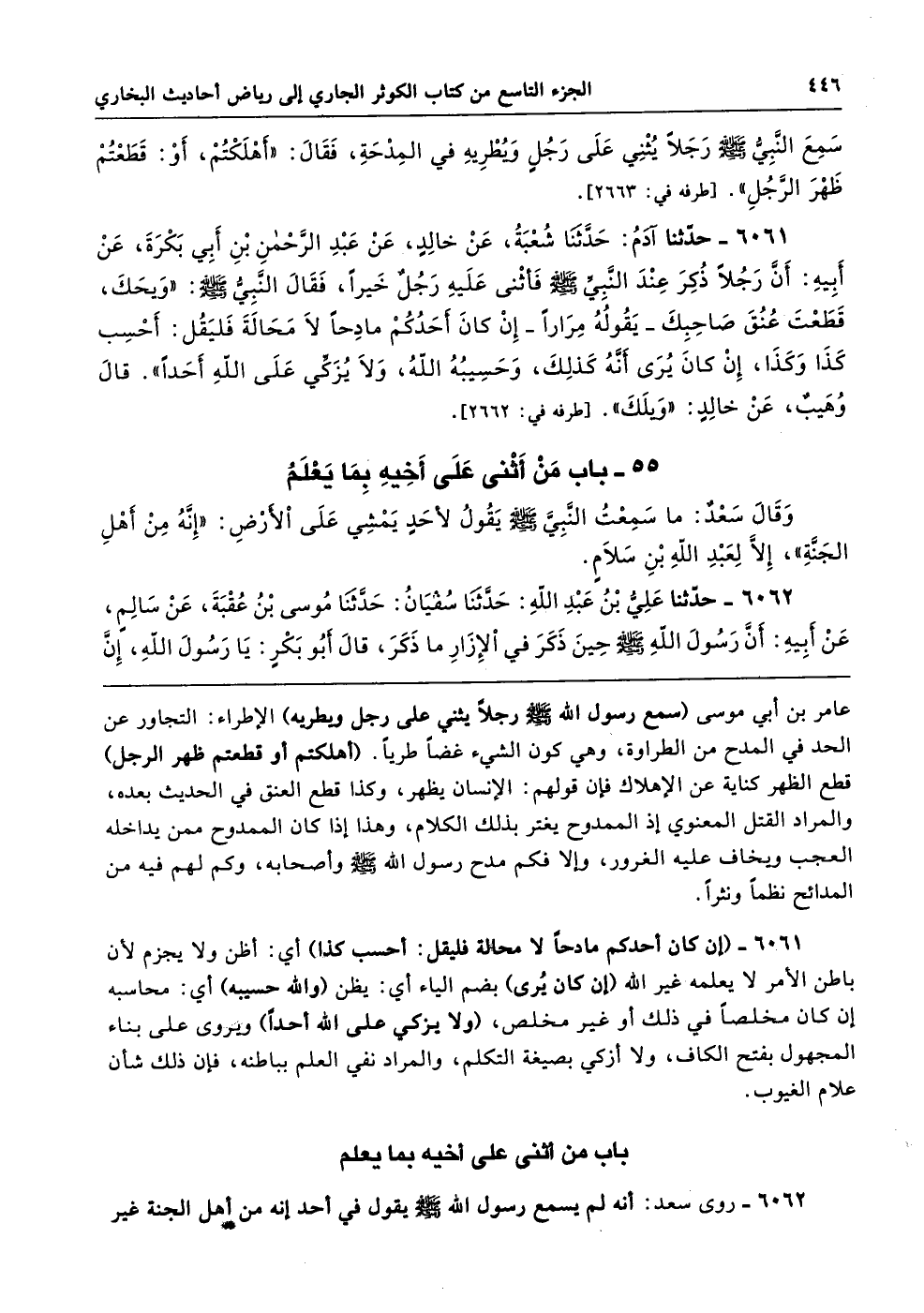سَمِعَ النَّبِىُّ - صلى الله عليه وسلم - رَجُلاً يُثْنِى عَلَى رَجُلٍ وَيُطْرِيهِ فِي الْمِدْحَةِ فَقَالَ «أَهْلَكْتُمْ - أَوْ قَطَعْتُمْ - ظَهْرَ الرَّجُلِ». طرفه 2663