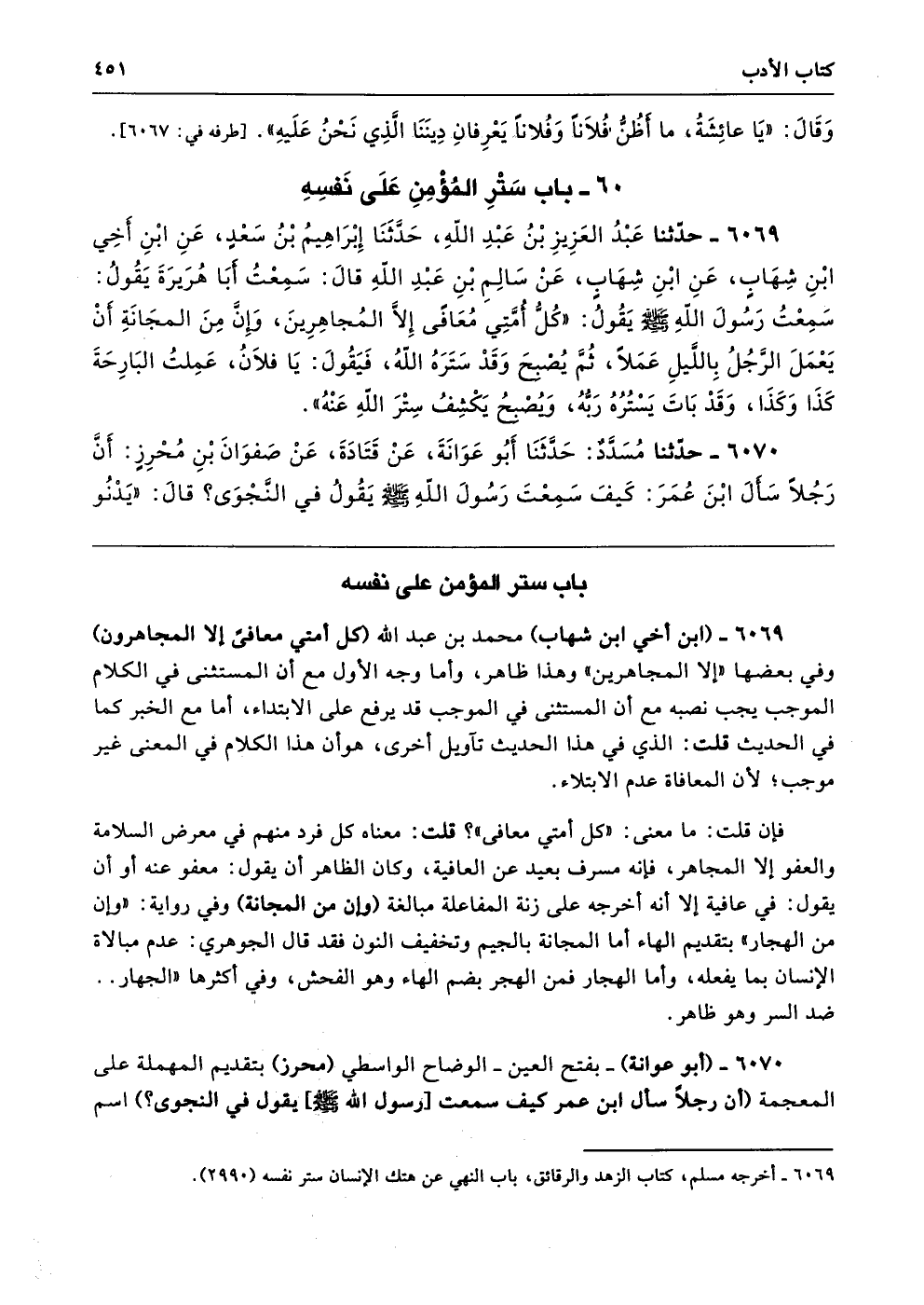 6069 - (ابن أخي ابن شهاب) محمد بن عبد الله (كل أمتي معافىً إلا المجاهرون) وفي بعضها "إلا المجاهرين" وهذا ظاهر، وأما وجه الأول مع أن المستثنى في الكلام الموجب يجب نصبه مع أن المستثنى في الموجب قد يرفع على الابتداء، أما مع الخبر كما في الحديث قلت: الذي في هذا الحديث تآويل أخرى، هو أن هذا الكلام في المعنى غير موجب؛ لأن المعافاة عدم الابتلاء.