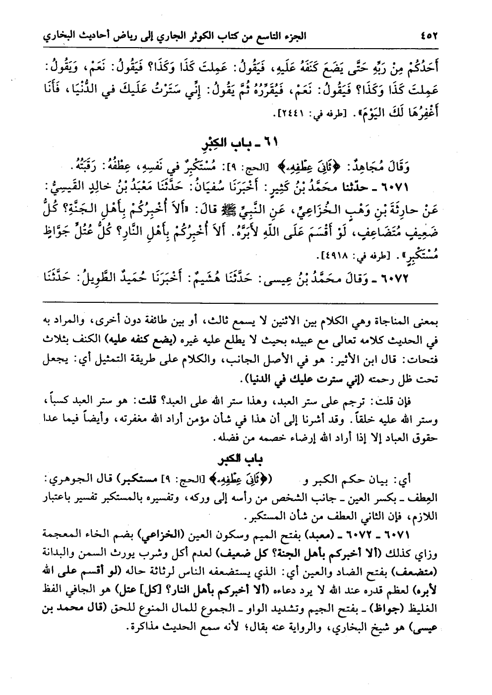 أي: بيان حكم الكبر و {ثَانِيَ عِطْفِهِ (9)} [الحج: 9] مستكبر) قال الجوهري: العِطف -بكسر العين- جانب الشخص من رأسه إلى وركه، وتفسيره بالمستكبر تفسير باعتبار اللازم، فإن الثاني العطف من شأن المستكبر.