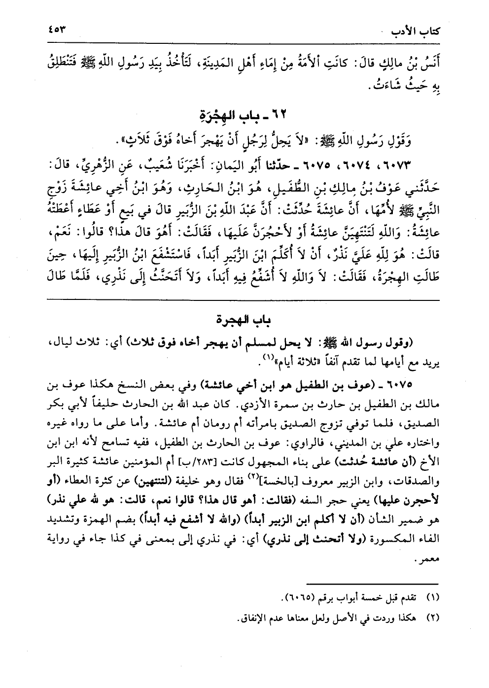 6073 و 6074 و 6075 - حَدَّثَنَا أَبُو الْيَمَانِ أَخْبَرَنَا شُعَيْبٌ عَنِ الزُّهْرِىِّ قَالَ حَدَّثَنِى عَوْفُ بْنُ مَالِكِ بْنِ الطُّفَيْلِ - هُوَ ابْنُ الْحَارِثِ وَهْوَ ابْنُ أَخِى عَائِشَةَ زَوْجِ النَّبِيِّ - صلى الله عليه وسلم - لأُمِّهَا - أَنَّ عَائِشَةَ حُدِّثَتْ أَنَّ عَبْدَ اللَّهِ بْنَ الزُّبَيْرِ قَالَ فِي بَيْعٍ أَوْ عَطَاءٍ أَعْطَتْهُ عَائِشَةُ وَاللَّهِ لَتَنْتَهِيَنَّ عَائِشَةُ، أَوْ لأَحْجُرَنَّ عَلَيْهَا. فَقَالَتْ أَهُوَ قَالَ هَذَا قَالُوا نَعَمْ. قَالَتْ هُوَ لِلَّهِ عَلَىَّ نَذْرٌ، أَنْ لاَ أُكَلِّمَ ابْنَ الزُّبَيْرِ أَبَدًا. فَاسْتَشْفَعَ ابْنُ الزُّبَيْرِ إِلَيْهَا، حِينَ طَالَتِ الْهِجْرَةُ فَقَالَتْ لاَ وَاللَّهِ لاَ أُشَفِّعُ فِيهِ أَبَدًا، وَلاَ أَتَحَنَّثُ إِلَى نَذْرِى. فَلَمَّا طَالَ