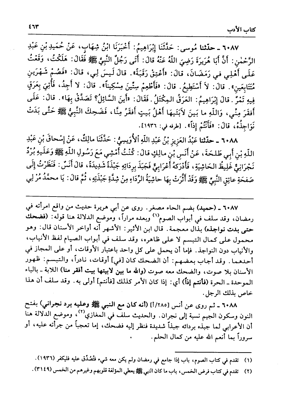 6088 - ثم روى عن أنس (أنه كان مع النبي -صلى الله عليه وسلم- وعليه برد نجراني) بفتح النون وسكون الجيم نسبة إلى نجران. والحديث سلف في المغازي، وموضع الدلالة هنا أن الأعرابي لما جبذه بردائه جبذًا شديدة فنظر إليه فضحك، إما تعجبًا من جرأته عليه، أو سرورًا بما أنعم الله عليه من كمال الحلم.