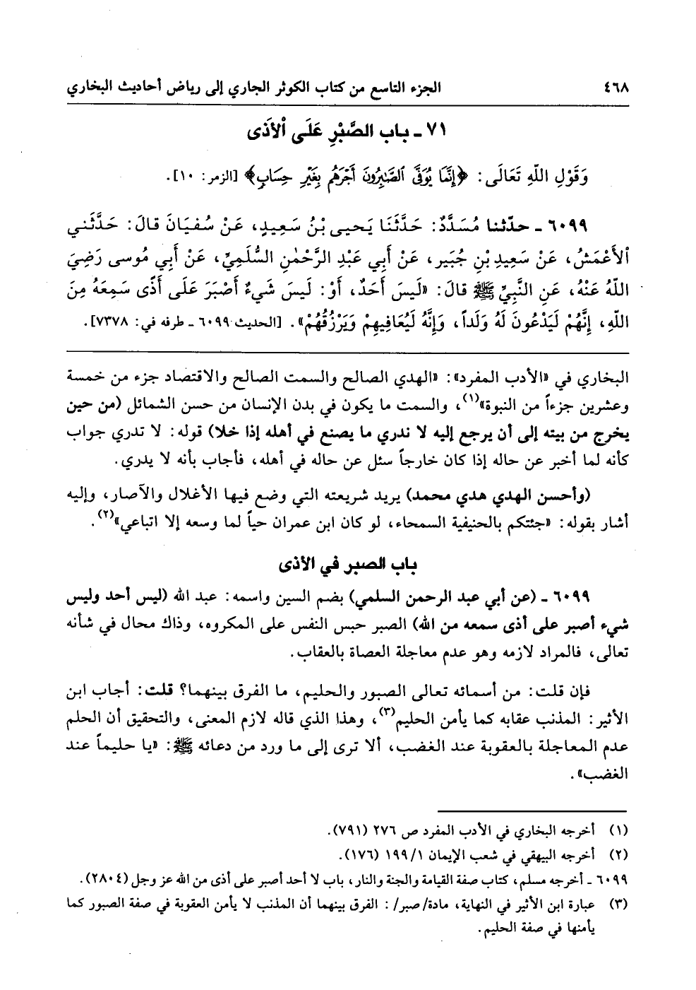 6099 - (عن أبي عبد الرحمن السلمي) بضم السين واسمه: عبد الله (ليس أحد وليس شيء أصبر على أذى سمعه من الله) الصبر حبس النفس على المكروه، وذاك محال في شأنه تعالى، فالمراد لازمه وهو عدم معاجلة العصاة بالعقاب.