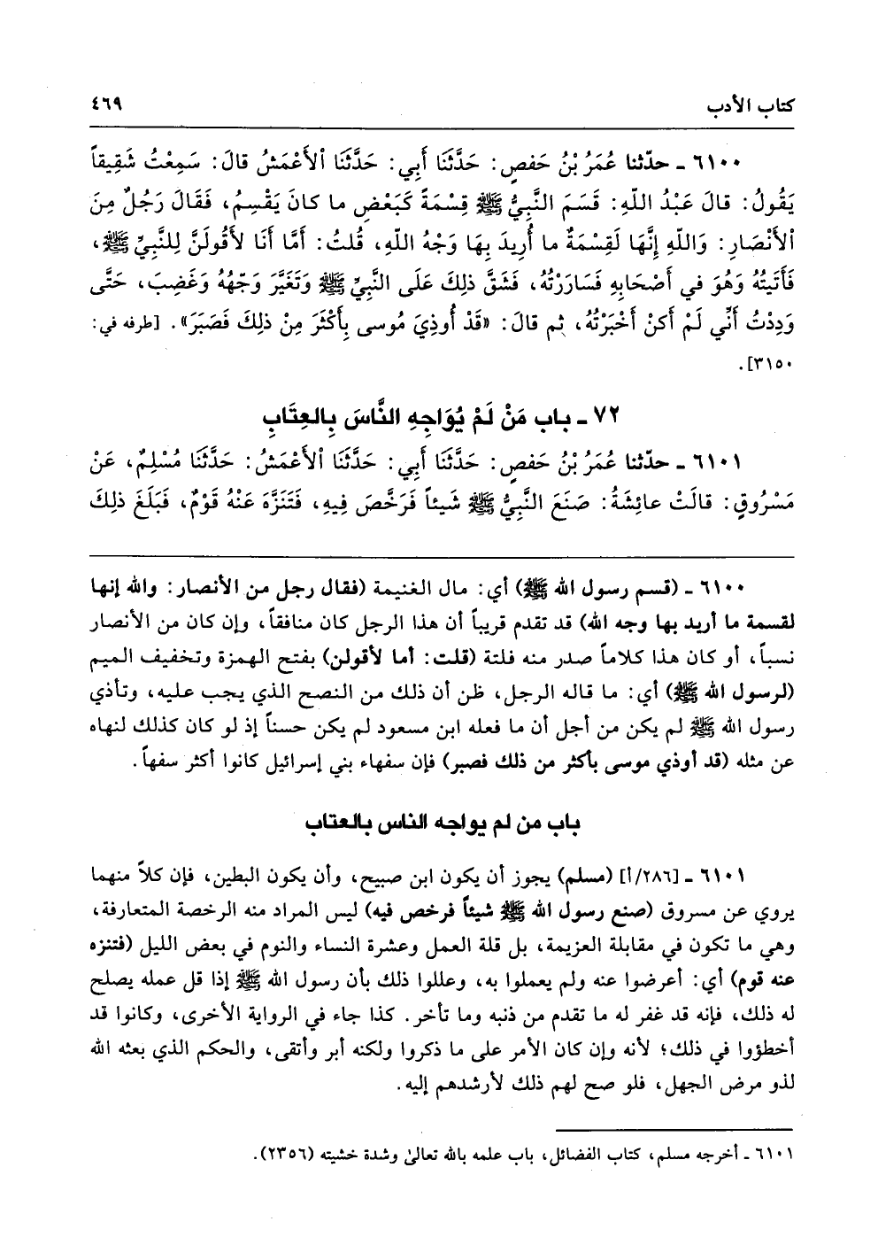 6100 - حَدَّثَنَا عُمَرُ بْنُ حَفْصٍ حَدَّثَنَا أَبِى حَدَّثَنَا الأَعْمَشُ قَالَ سَمِعْتُ شَقِيقًا يَقُولُ قَالَ عَبْدُ اللَّهِ قَسَمَ النَّبِىُّ - صلى الله عليه وسلم - قِسْمَةً كَبَعْضِ مَا كَانَ يَقْسِمُ، فَقَالَ رَجُلٌ مِنَ الأَنْصَارِ وَاللَّهِ إِنَّهَا لَقِسْمَةٌ مَا أُرِيدَ بِهَا وَجْهُ اللَّهِ. قُلْتُ أَمَّا أَنَا لأَقُولَنَّ لِلنَّبِىِّ - صلى الله عليه وسلم - فَأَتَيْتُهُ وَهْوَ فِي أَصْحَابِهِ فَسَارَرْتُهُ فَشَقَّ ذَلِكَ عَلَى النَّبِيِّ - صلى الله عليه وسلم - وَتَغَيَّرَ وَجْهُهُ وَغَضِبَ، حَتَّى وَدِدْتُ أَنِّى لَمْ أَكُنْ أَخْبَرْتُهُ ثُمَّ قَالَ «قَدْ أُوذِىَ مُوسَى بِأَكْثَرَ مِنْ ذَلِكَ فَصَبَرَ». طرفه 3150