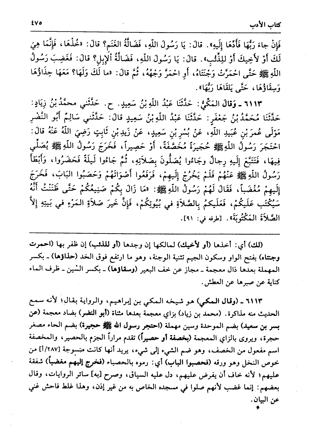 6113 - وَقَالَ الْمَكِّىُّ حَدَّثَنَا عَبْدُ اللَّهِ بْنُ سَعِيدٍ. وَحَدَّثَنِى مُحَمَّدُ بْنُ زِيَادٍ حَدَّثَنَا مُحَمَّدُ بْنُ جَعْفَرٍ حَدَّثَنَا عَبْدُ اللَّهِ بْنُ سَعِيدٍ قَالَ حَدَّثَنِى سَالِمٌ أَبُو النَّضْرِ مَوْلَى عُمَرَ بْنِ عُبَيْدِ اللَّهِ عَنْ بُسْرِ بْنِ سَعِيدٍ عَنْ زَيْدِ بْنِ ثَابِتٍ - رضى الله عنه - قَالَ احْتَجَرَ رَسُولُ اللَّهِ - صلى الله عليه وسلم - حُجَيْرَةً مُخَصَّفَةً أَوْ حَصِيرًا، فَخَرَجَ رَسُولُ اللَّهِ - صلى الله عليه وسلم - يُصَلِّى فِيهَا، فَتَتَبَّعَ إِلَيْهِ رِجَالٌ وَجَاءُوا يُصَلُّونَ بِصَلاَتِهِ، ثُمَّ جَاءُوا لَيْلَةً فَحَضَرُوا وَأَبْطَأَ رَسُولُ اللَّهِ - صلى الله عليه وسلم - عَنْهُمْ، فَلَمْ يَخْرُجْ إِلَيْهِمْ فَرَفَعُوا أَصْوَاتَهُمْ وَحَصَبُوا الْبَابَ، فَخَرَجَ إِلَيْهِمْ مُغْضَبًا فَقَالَ لَهُمْ رَسُولُ اللَّهِ - صلى الله عليه وسلم - «مَا زَالَ بِكُمْ صَنِيعُكُمْ حَتَّى ظَنَنْتُ أَنَّهُ سَيُكْتَبُ عَلَيْكُمْ، فَعَلَيْكُمْ بِالصَّلاَةِ فِي بُيُوتِكُمْ، فَإِنَّ خَيْرَ صَلاَةِ الْمَرْءِ فِي بَيْتِهِ، إِلاَّ الصَّلاَةَ الْمَكْتُوبَةَ». طرفه 91