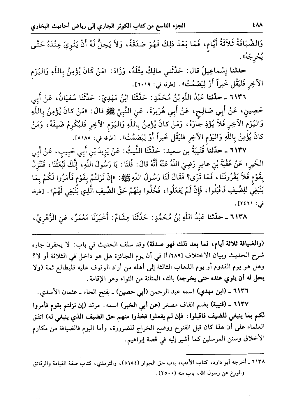 6137 - (قتيبة) بضم القاف مصغر (عن أبي الخير) اسمه: مرثد (إن نزلتم بقوم فأمروا لكم بما ينبغي للضيف فاقبلوا، فإن لم يفعلوا فخذوا منهم حق الضيف الذي ينبغي له) اتفق العلماء على أن هذا كان قبل الفتوح ووضع الخراج للضرورة، وأما اليوم فالضيافة من مكارم الأخلاق وسنن المرسلين كما أشير إليه في قصة إبراهيم.