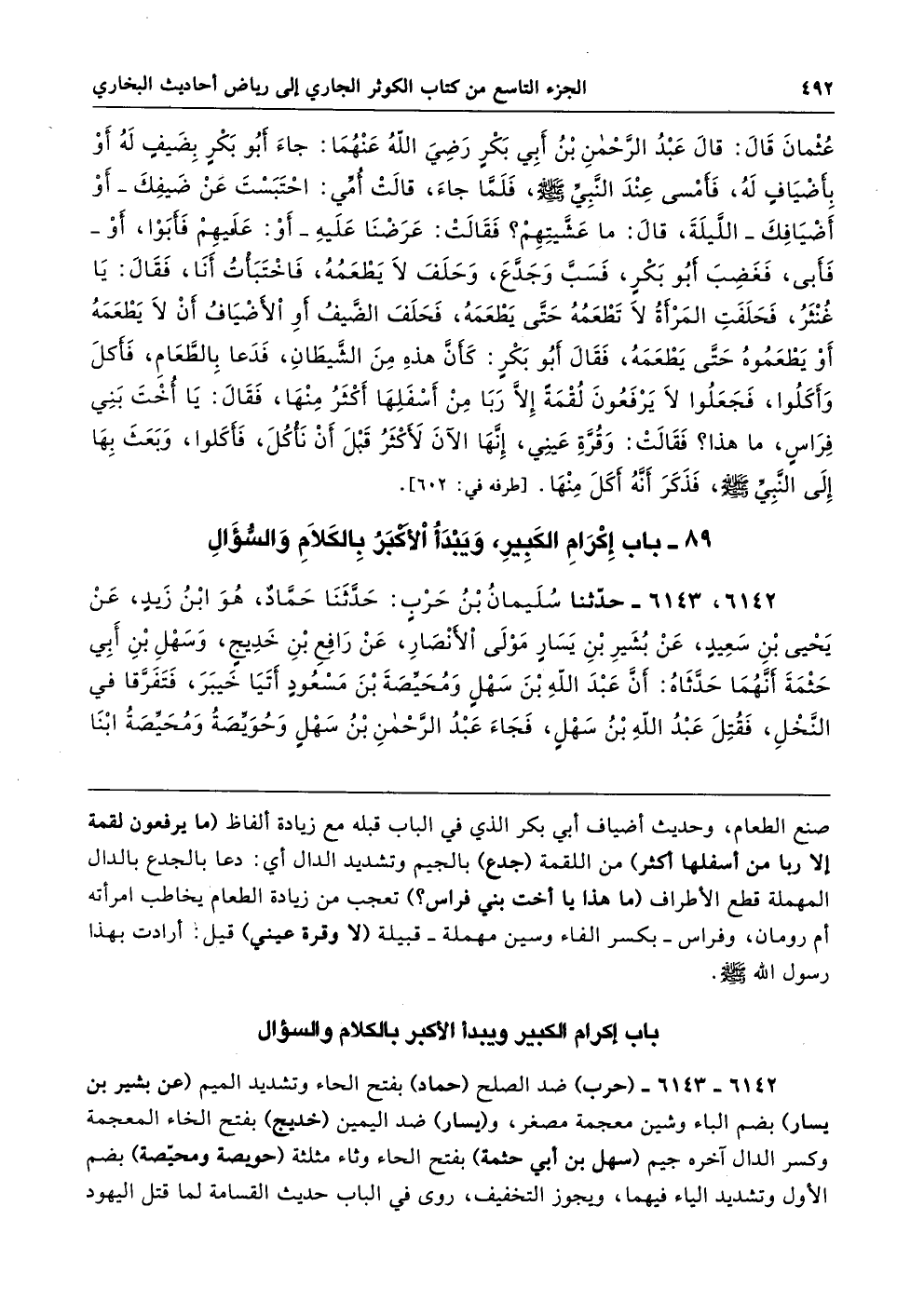 6142 - 6143 - (حرب) ضد الصلح (حماد) بفتح الحاء وتشديد الميم (عن بشير بن يسار) بضم الباء وشين معجمة مصغر، و (يسار) ضد اليمين (خديج) بفتح الخاء المعجمة وكسر الدال آخره جيم (سهل بن أبي حثمة) بفتح الحاء وثاء مثلثة (حويصة ومحيّصة) بضم الأول وتشديد الياء فيهما، ويجوز التخفيف، روى في الباب حديث القسامة لما قتل اليهود