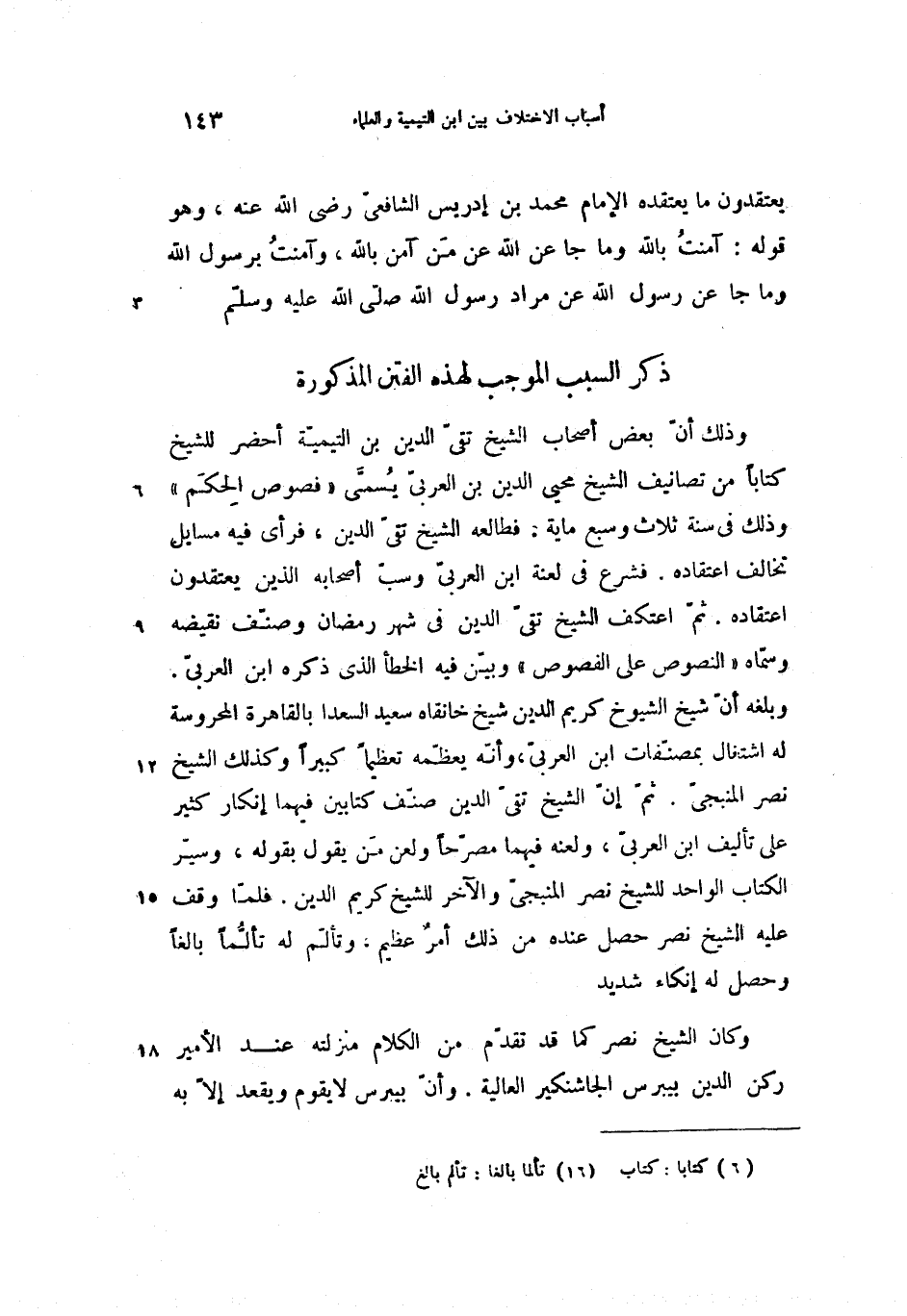 وذلك أنّ بعض أصحاب الشيخ تقىّ الدين بن التيميّة أحضر للشيخ كتابا (6) من تصانيف الشيخ محيى الدين بن العربىّ يسمّى «فصوص الحكم» وذلك فى سنة ثلاث وسبع ماية، فطالعه الشيخ تقىّ الدين، فرأى فيه مسايل تخالف اعتقاده. فشرع فى لعنة ابن العربىّ وسبّ أصحابه الذين يعتقدون اعتقاده. ثمّ اعتكف الشيخ تقىّ الدين فى شهر رمضان وصنّف نقيضه وسمّاه «النصوص على الفصوص» وبيّن فيه الخطأ الذى ذكره ابن العربىّ.