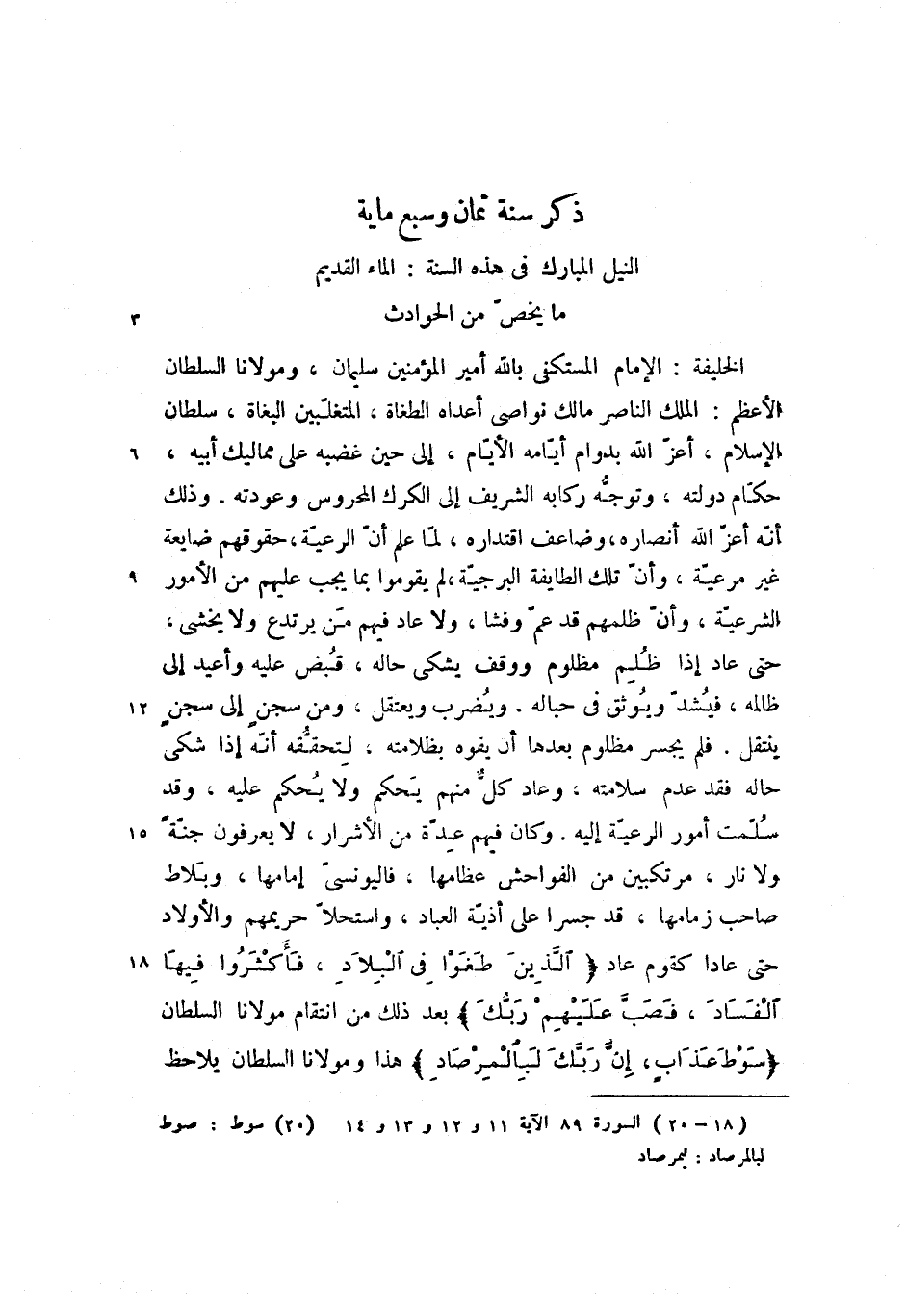 الخليفة: الإمام المستكفى بالله أمير المؤمنين سليمان، ومولانا السلطان الأعظم: الملك الناصر مالك نواصى أعداه الطغاة، المتغلّبين البغاة، سلطان الإسلام، أعزّ الله بدوام أيّامه الأيّام، إلى حين غضبه على مماليك أبيه، حكّام دولته، وتوجّه ركابه الشريف إلى الكرك المحروس وعودته. وذلك أنّه أعزّ الله أنصاره، وضاعف اقتداره، لمّا علم أنّ الرعيّة، حقوقهم ضايعة غير مرعيّة، وأنّ تلك الطايفة البرجيّة، لم يقوموا بما يجب عليهم من الأمور الشرعيّة، وأنّ ظلمهم قد عمّ وفشا، ولا عاد فيهم من يرتدع ولا يخشى، حتى عاد إذا ظلم مظلوم ووقف يشكى حاله، قبض عليه وأعيد إلى ظالمه، فيشدّ ويوثق فى حباله، ويضرب ويعتقل، ومن سجن إلى سجن ينتقل. فلم يجسر مظلوم بعدها أن يفوه بظلامته، لتحقّقه أنّه إذا شكى حاله فقد عدم سلامته، وعاد كلّ منهم يحكم ولا يحكم عليه، وقد سلّمت أمور الرعيّة إليه. وكان فيهم عدّة من الأشرار، لا يعرفون جنّة ولا نار، مرتكبين من الفواحش عظامها، فاليونسىّ إمامها، وبلاط صاحب زمامها، قد جسرا على أذيّة العباد، واستحلا حريمهم والأولاد حتى عادا كقوم عاد {الَّذِينَ طَغَوْا فِي الْبِلادِ، فَأَكْثَرُوا فِيهَا الْفَسادَ، فَصَبَّ عَلَيْهِمْ رَبُّكَ} (19) بعد ذلك من انتقام مولانا السلطان {سَوْطَ (20)} عَذابٍ، إِنَّ رَبَّكَ لَبِالْمِرْصادِ هذا ومولانا السلطان يلاحظ