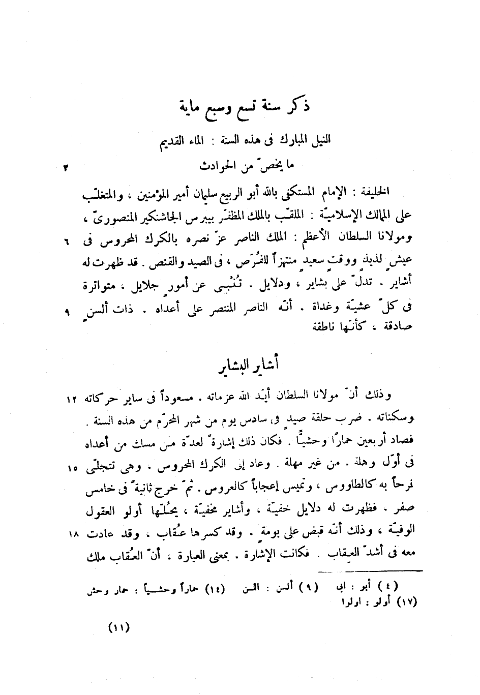 الخليفة: الإمام المستكفى بالله أبو (4) الربيع سليمان أمير المؤمنين، والمتغلّب على الممالك الإسلاميّة: الملقّب بالملك المظفّر بيبرس الجاشنكير المنصورىّ، ومولانا السلطان الأعظم: الملك الناصر عزّ نصره بالكرك المحروس فى عيش لذيذ ووقت سعيد منتهزا للفرص، فى الصيد والقنص. قد ظهرت له أشاير، تدلّ على بشاير، ودلايل، تنبى عن أمور جلايل، متواترة فى كلّ عشيّة وغداة، أنّه الناصر المنتصر على أعداه، ذات ألسن (9) صادقة، كأنّها ناطقة