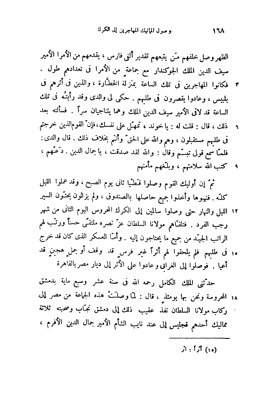 فكانوا المهاجرين فى تلك الساعة بمنزلة الخطّارة، والذين فى أثرهم فى بلبيس، وعادوا يقصرون فى طلبهم. حكى لى والدى وقد رأيته فى تلك الساعة قد لاقى الأمير سيف الدين الملك وهما يتناجيان سرا. فسألته بعد ذلك، قال: قلت له: يا خوند، تمهّل على نفسك، فإنّ القوم الذين خرجتم فى طلبهم مستقبلون، وهم والله على الحقّ وأنتم بخلاف ذلك. قال والدى: