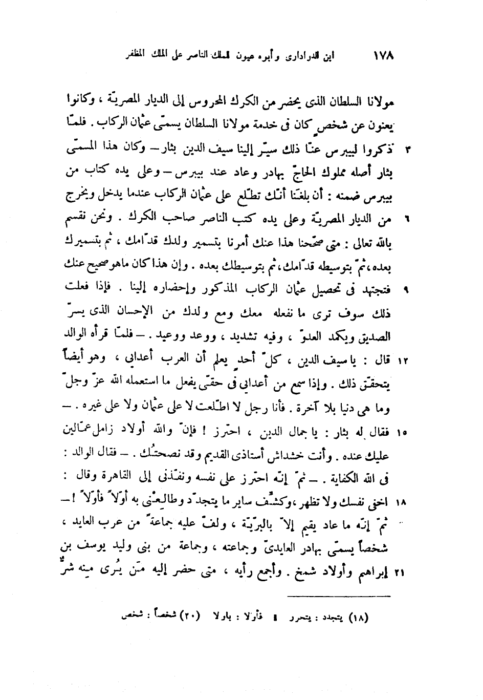 مولانا السلطان الذى يحضر من الكرك المحروس إلى الديار المصريّة، وكانوا يعنون عن شخص كان فى خدمة مولانا السلطان يسمّى عثمان الركاب. فلمّا ذكروا لبيبرس عنّا ذلك سيّر إلينا سيف الدين بثار-وكان هذا المسمّى بثار أصله مملوك الحاجّ بهادر وعاد عند بيبرس-وعلى يده كتاب من بيبرس ضمنه: أن بلغنا أنّك تطّلع على عثمان الركاب عند ما يدخل ويخرج من الديار المصريّة وعلى يده كتب الناصر صاحب الكرك. ونحن نقسم بالله تعالى: متى صحّحنا هذا عنك أمرنا بتسمير ولدك قدّامك، ثم بتسميرك بعده، ثمّ بتوسيطه قدّامك، ثم بتوسيطك بعده. وإن هذا كان ما هو صحيح عنك فتجتهد فى تحصيل عثمان الركاب المذكور وإحضاره إلينا. فإذا فعلت ذلك سوف ترى ما نفعله معك ومع ولدك من الإحسان الذى يسرّ الصديق ويكمد العدوّ، وفيه تشديد، ووعد ووعيد. -فلمّا قرأه الوالد قال: يا سيف الدين، كلّ أحد يعلم أن العرب أعدايى، وهو أيضا يتحقّق ذلك. وإذا سمع من أعدايى فى حقّى يفعل ما استعمله الله عزّ وجلّ وما هى دنيا بلا آخرة. فأنا رجل لا اطّلعت لا على عثمان ولا على غيره. - فقال له بثار: يا جمال الدين، احترز! فإنّ والله أولاد زامل عمّالين عليك عنده. وأنت خشداش أستاذى القديم وقد نصحتك. -فقال الوالد: