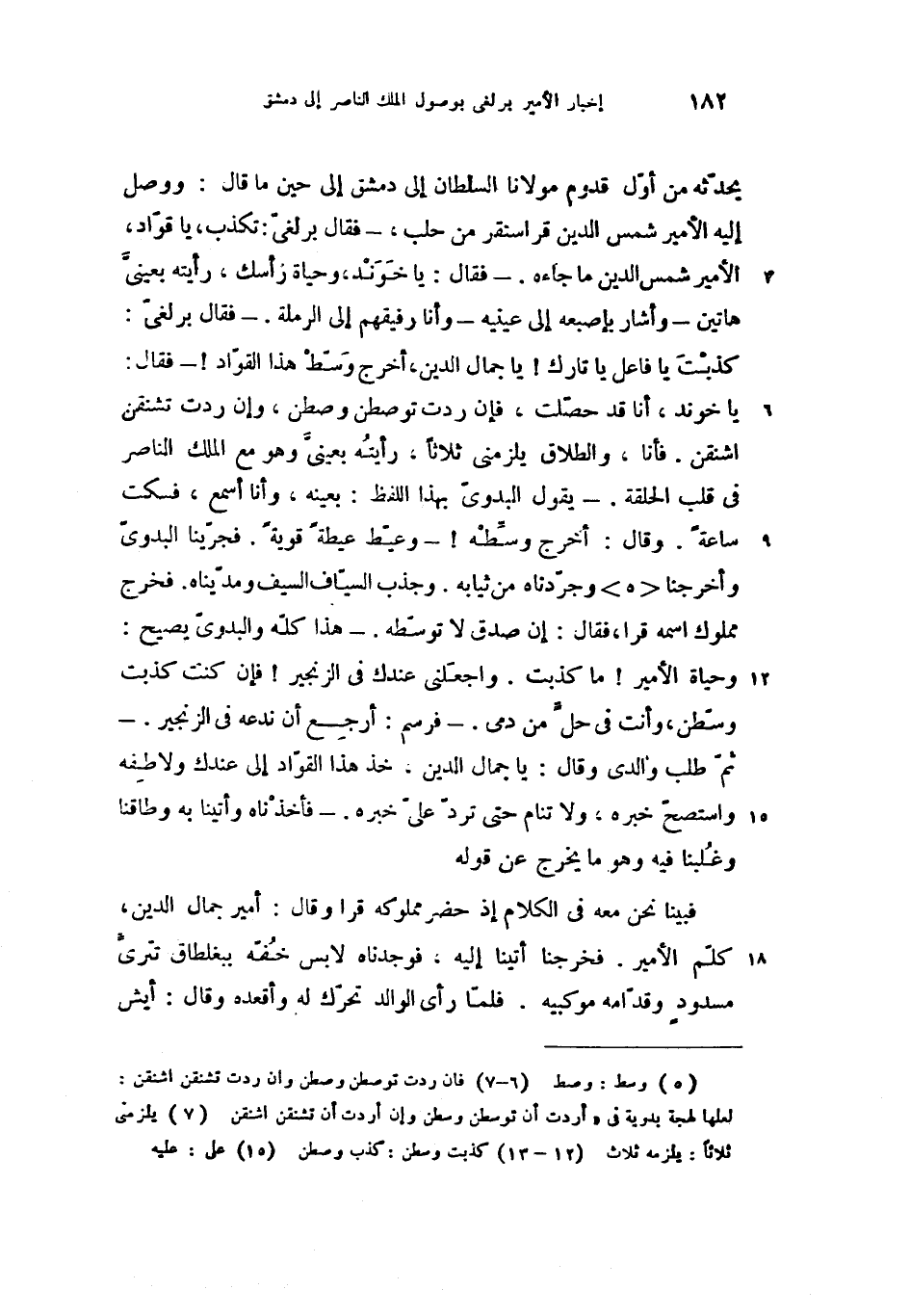 يحدّثه من أوّل قدوم مولانا السلطان إلى دمشق إلى حين ما قال: ووصل إليه الأمير شمس الدين قراسنقر من حلب، -فقال برلغىّ: تكذب، يا قوّاد، الأمير شمس الدين ما جاءه. -فقال: يا خوند، وحياة رأسك، رأيته بعينىّ هاتين-وأشار بإصبعه إلى عينيه-وأنا رفيقهم إلى الرملة. -فقال برلغىّ:
