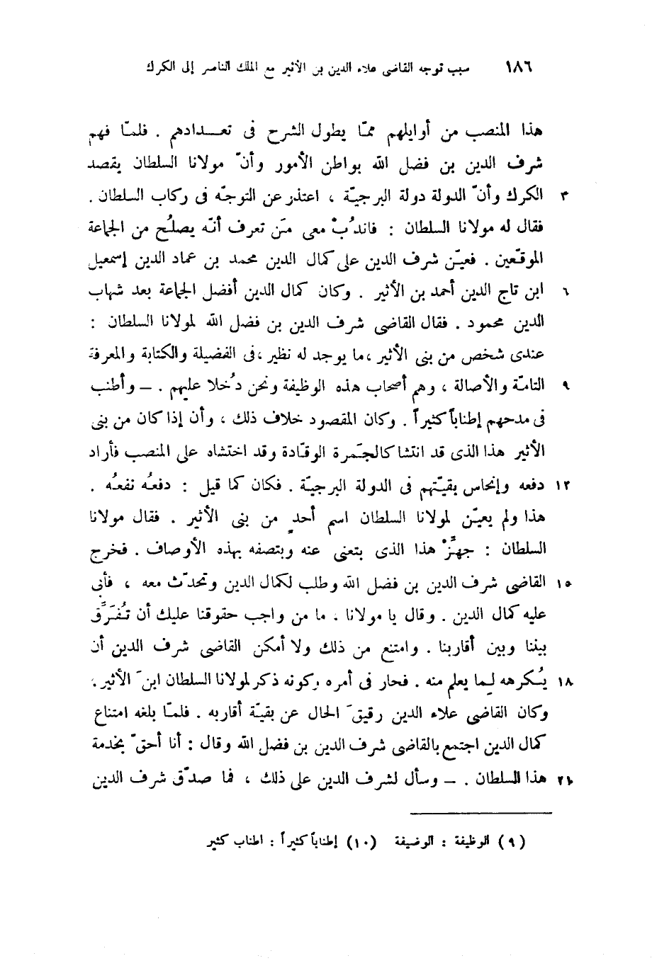 هذا ولم يعيّن لمولانا السلطان اسم أحد من بنى الأثير. فقال مولانا السلطان: جهّز هذا الذى بتعنى عنه وبتصفه بهذه الأوصاف. فخرج القاضى شرف الدين بن فضل الله وطلب لكمال الدين وتحدّث معه، فأبى عليه كمال الدين. وقال يا مولانا، ما من واجب حقوقنا عليك أن تفرّق بيننا وبين أقاربنا. وامتنع من ذلك ولا أمكن القاضى شرف الدين أن يكرهه لما يعلم منه. فحار فى أمره وكونه ذكر لمولانا السلطان ابن الأثير.