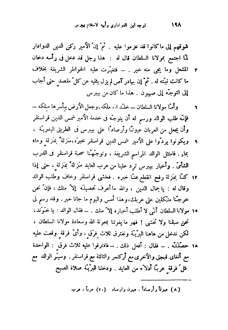 وأمّا مولانا السلطان-خلّد الله ملكه، وجعل الأرض بأسرها ملكه- فإنّه طلب الوالد ورسم له أن يتوجّه فى خدمة الأمير شمس الدين قراسنقر وأن يجعل من العربان عيونا (8) وأرصادا على بيبرس فى الطريق البدريّة، ويكونوا يردّوا على الأمير شمس الدين قراسنقر خبره، منزلة بمنزلة وماء بماء. فامتثل الوالد المراسم الشريفة، وتوجّهنا صحبة قراسنقر فى الدرب الشأمىّ. وأخبار بيبرس ترد علينا من عرب العايد منزلة بمنزلة، حتى إذا كنّا بمنزلة رفح انقطع عنّا خبره. فخشى قراسنقر وخاف وطلب الوالد وقال له: يا جمال الدين، والله ما أعرف تحصيله إلاّ منك، فإنّ نحن خرجنا متّكلين على عربك، وهذا أمس واليوم ما جانا خبر. وقد رسم لى مولانا السلطان أنّى لا أطلب أخباره إلاّ منك. -فقال الوالد: يا خوند، نحن سبقنا ولا تخشى! فهو ما يفوتنا بمعونة الله وسعادة مولانا السلطان، لكن ندخل من هاهنا البرّيّة ونفترق ثلاث فرق، وأىّ فرقة وقعت عليه حصّلته. -فقال: أفعل ذلك. -فافترقوا عليه ثلاث فرق: الواحدة مع أنغاى قبجق والأخرى مع أركتمر والثالثة مع قراسنقر. وسيّر الوالد مع كلّ فرقة عربا (20) أدلاء من العايد. ودخلنا البّريّة صلاة الصبح