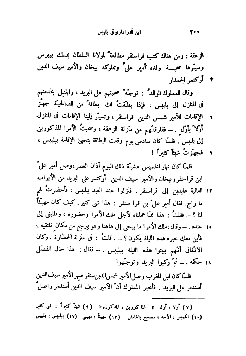 وقال للمملوك الوالد: توجّه صحبتهم على البريد، وابتتل بخدمتهم فى المنازل إلى بلبيس، فإذا بطّقت لك بطاقة من الصالحيّة جهّز الإقامات للأمير شمس الدين قراسنقر، وتسيّر إلينا الإقامات فى المنازل أوّلا (7) بأوّل. -ففارقتهم من منزلة الزعقة، وصحبت الأمرا المذكورين إلى بلبيس. فلمّا كان سادس يوم وقعت البطاقة بتجهيز الإقامة ببلبيس، فجهّزت شيئا (9) كثيرا!