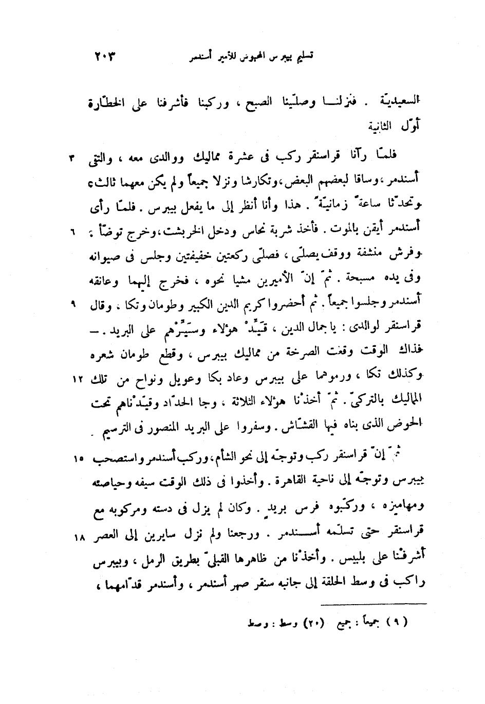 فلمّا رآنا قراسنقر ركب فى عشرة مماليك ووالدى معه، والتقى أسندمر، وساقا لبعضهم البعض، وتكارشا ونزلا جميعا ولم يكن معهما ثالث، وتحدّثا ساعة زمانيّة. هذا وأنا أنظر إلى ما يفعل بيبرس. فلمّا رأى أسندمر أيقن بالموت. فأخذ شربة نحاس ودخل الخربشت، وخرج توضّأ، وفرش منشفة ووقف يصلّى، فصلّى ركعتين خفيفتين وجلس فى صيوانه وفى يده مسبحة. ثمّ إنّ الأميرين مشيا نحوه، فخرج إليهما وعانقه أسندمر وجلسوا جميعا (9). ثم أحضروا كريم الدين الكبير وطومان وتكا، وقال قراسنقر لوالدى: يا جمال الدين، قيّد هؤلاء وسيّرهم على البريد. - فذاك الوقت وقعت الصرخة من مماليك بيبرس، وقطع طومان شعره وكذلك تكا، ورموهما على بيبرس وعاد بكا وعويل ونواح من تلك المماليك بالتركىّ. ثمّ أخذنا هؤلاء الثلاثة، وجاء الحدّاد وقيّدناهم تحت الحوض الذى بناه فيها القشّاش. وسفروا على البريد المنصور فى الترسيم.