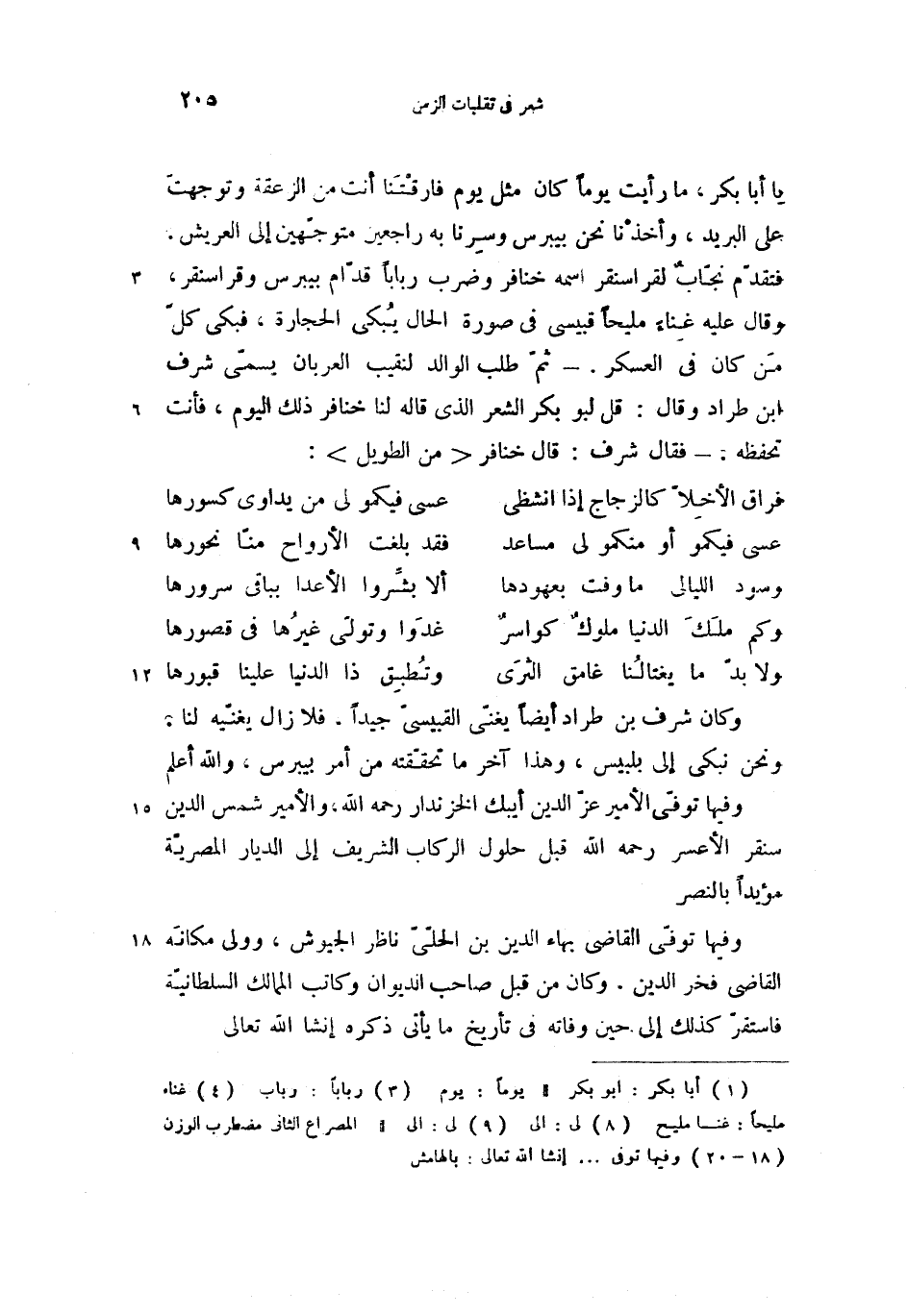 فتقدّم نجّاب لقراسنقر اسمه خنافر وضرب ربابا (3) قدّام بيبرس وقراسنقر، وقال عليه غناء (4) مليحا قبيسى فى صورة الحال يبكى الحجارة، فبكى كلّ من كان فى العسكر. -ثمّ طلب الوالد لنقيب العربان يسمّى شرف ابن طراد وقال: قل لبو بكر الشعر الذى قاله لنا خنافر ذلك اليوم، فأنت تحفظه، -فقال شرف: قال خنافر <من الطويل>:
