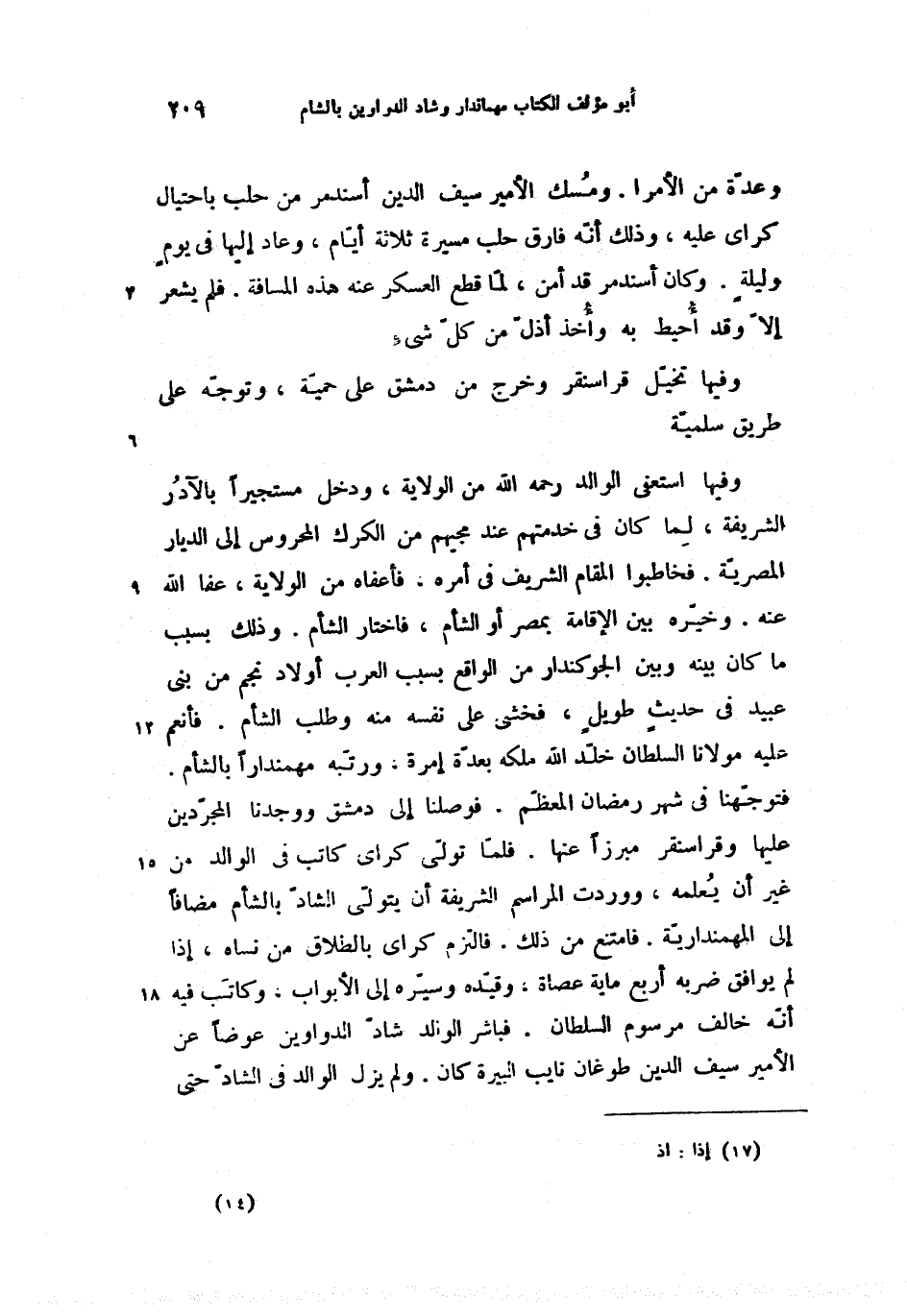 فتوجّهنا فى شهر رمضان المعظّم. فوصلنا إلى دمشق ووجدنا المجرّدين عليها وقراسنقر مبرزا عنها. فلمّا تولّى كراى كاتب فى الوالد من غير أن يعلمه، ووردت المراسم الشريفة أن يتولّى الشادّ بالشأم مضافا إلى المهمنداريّة. فامتنع من ذلك. فالتزم كراى بالطلاق من نساه، إذا (17) لم يوافق ضربه أربع ماية عصاة. وقيّده وسيّره إلى الأبواب، وكاتب فيه أنّه خالف مرسوم السلطان. فباشر الوالد شادّ الدواوين عوضا عن الأمير سيف الدين طوغان نايب البيرة كان. ولم يزل الوالد فى الشادّ حتى