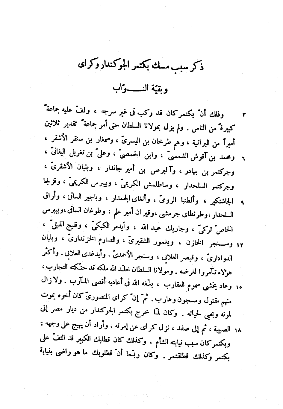 وذلك أنّ بكتمر كان قد ركب فى غير سرجه، ولفّ عليه جماعة كبيرة من الناس. ولم يزل بمولانا السلطان حتى أمر جماعة تقدير ثلاثين أميرا من البرانية، وهم طرخان بن اليسرىّ، وصمغار بن سنقر الأشقر، ومحمد بن آقوش الشمسىّ، وابن الحمصىّ، وعلىّ بن تغريل اليغانىّ، وجركتمر بن بهادر، وآلبرص بن أمير جاندار، وبلبان الأشقرىّ، وجركتمر السلحدار، وساطلمش الكريمىّ، وبيبرس الكريمىّ، وقزلجا الجاشنكير، وألطنبا الرومىّ، وأنغاى الجمدار، وباجير الساقى، وأراق السلحدار، وطرنطاى جرمشى، وقيران أمير علم، وطوغان الساقى، وبيبرس الخاصّ تركىّ، وجاريك عبد الله، وأيدمر الكبكىّ، وقليج القبقىّ، وسنجر الخازن، ويغمور الشقيرىّ، والصارم الخزندارىّ، وبلبان الدوادارىّ، وقيصر العلايى، وسنجر الأحمدىّ. وأيدغدى العلايى. وأكثر هؤلاء تآمروا لغرضه. ومولانا السلطان خلّد الله ملكه قد حنّكته التجارب، وعاد يخشى سموم العقارب، بلّغه الله فى أعاديه أقصى المآرب. ولا زال منهم مقتول ومسجون وهارب. ثمّ إنّ كراى المنصورىّ كان أخوه يموت لموته ويحيى لحياته. وكان لمّا خرج بكتمر الجوكندار من ديار مصر إلى الصبيبة، ثم إلى صفد، نزل كراى عن إمرته، وأراد أن يهيج على وجهه.