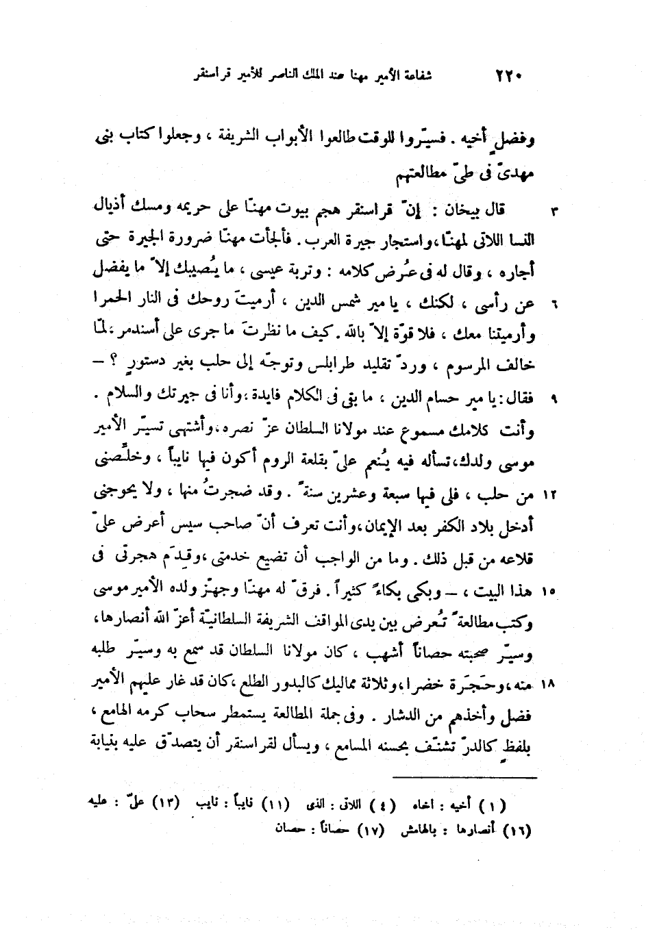 وأنت كلامك مسموع عند مولانا السلطان عزّ نصره، وأشتهى تسيّر الأمير موسى ولدك، تسأله فيه ينعم علىّ بقلعة الروم أكون فيها نايبا (11)، وخلّصنى من حلب، فلى فيها سبعة وعشرين سنة. وقد ضجرت منها، ولا يحوجنى أدخل بلاد الكفر بعد الإيمان، وأنت تعرف أنّ صاحب سيس أعرض علىّ (13) قلاعه من قبل ذلك. وما من الواجب أن تضيع خدمتى، وقدم هجرتى فى هذا البيت، -وبكى بكاء كثيرا. فرقّ له مهنّا وجهّز ولده الأمير موسى وكتب مطالعة تعرض بين يدى المواقف الشريفة السلطانيّة أعزّ الله أنصارها (16)، وسيّر صحبته حصانا (17) أشهب، كان مولانا السلطان قد سمع به وسيّر طلبه منه، وحجرة خضرا، وثلاثة مماليك كالبدور الطلع، كان قد غار عليهم الأمير فضل وأخذهم من الدشار. وفى جملة المطالعة يستمطر سحاب كرمه الهامع، بلفظ كالدرّر تشنّف بحسنه المسامع، ويسأل لقراسنقر أن يتصدّق عليه بنيابة