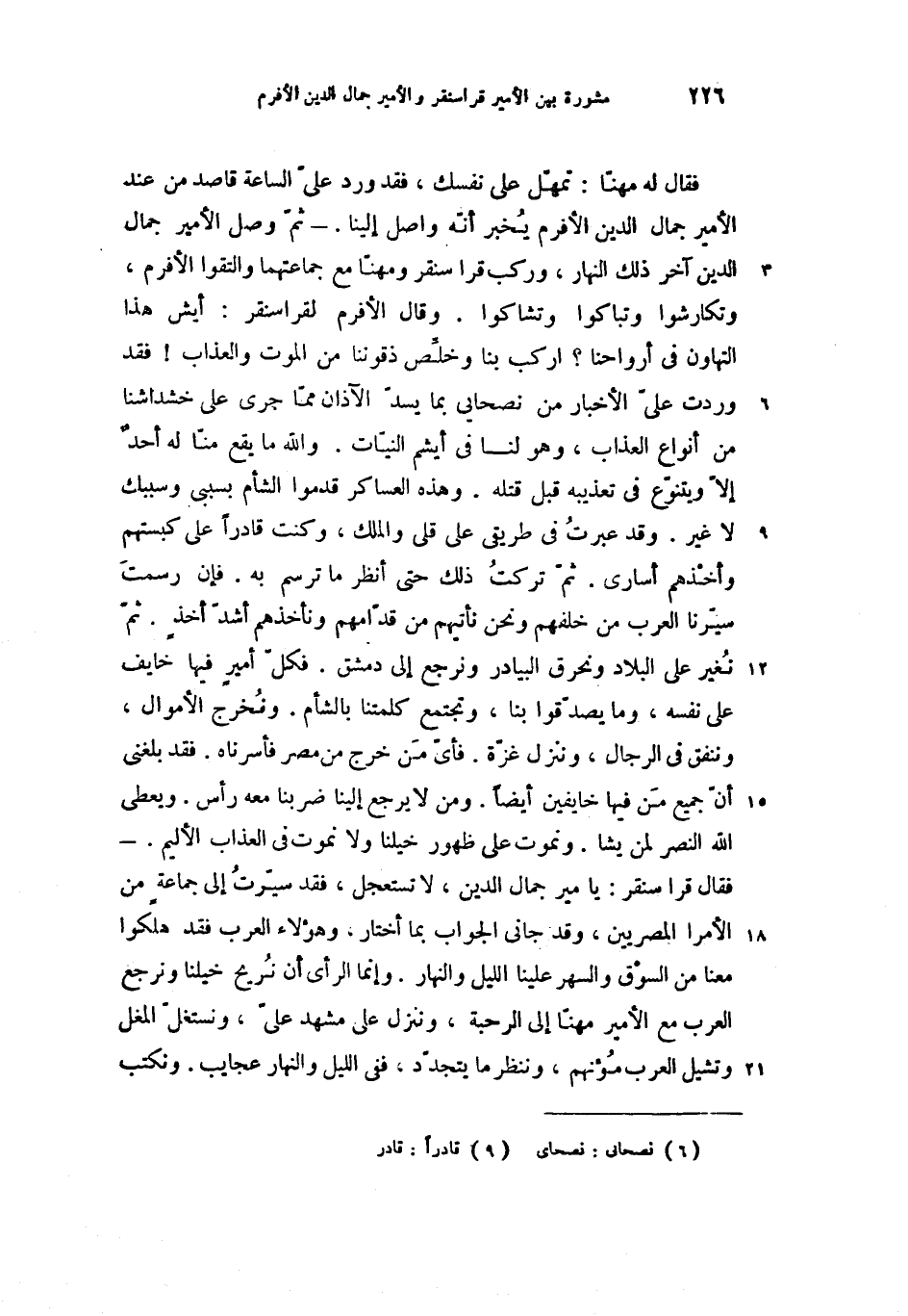 فقال له مهنّا: تمهّل على نفسك، فقد ورد علىّ الساعة قاصد من عند الأمير جمال الدين الأفرم يخبر أنّه واصل إلينا. -ثمّ وصل الأمير جمال الدين آخر ذلك النهار، وركب قراسنقر ومهنّا مع جماعتهما والتقوا الأفرم، وتكارشوا وتباكوا وتشاكوا. وقال الأفرم لقراسنقر: أيش هذا التهاون فى أرواحنا؟ اركب بنا وخلّص ذقوننا من الموت والعذاب! فقد وردت علىّ الأخبار من نصحايى (6) بما يسدّ الآذان ممّا جرى على خشداشنا من أنواع العذاب، وهو لنا فى أيشم النيّات. والله ما يقع منّا له أحد إلاّ ويتنوّع فى تعذيبه قبل قتله. وهذه العساكر قدموا الشأم بسببى وسببك لا غير. وقد عبرت فى طريقى على قلى والملك، وكنت قادرا (9) على كبستهم وأخذهم أسارى. ثمّ تركت ذلك حتى أنظر ما ترسم به. فإن رسمت سيّرنا العرب من خلفهم ونحن نأتيهم من قدّامهم ونأخذهم أشدّ أخذ. ثمّ نغير على البلاد ونحرق البيادر ونرجع إلى دمشق. فكلّ أمير فيها خايف على نفسه، وما يصدّقوا بنا، وتجتمع كلمتنا بالشأم. ونخرج الأموال، وننفق فى الرجال، وننزل غزّة. فأىّ من خرج من مصر فأسرناه. فقد بلغنى أنّ جميع من فيها خايفين أيضا. ومن لا يرجع إلينا ضربنا معه رأس. ويعطى الله النصر لمن يشا. ونموت على ظهور خيلنا ولا نموت فى العذاب الأليم. - فقال قراسنقر: يامير جمال الدين، لا تستعجل، فقد سيّرت إلى جماعة من الأمرا المصريين، وقد جانى الجواب بما أختار، وهؤلاء العرب فقد هلكوا معنا من السوق والسهر علينا الليل والنهار. وإنما الرأى أن نريح خيلنا ونرجع العرب مع الأمير مهنّا إلى الرحبة، وننزل على مشهد علىّ، ونستغلّ المغل وتشيل العرب مؤنهم، وننظر ما يتجدّد، ففى الليل والنهار عجايب. ونكتب