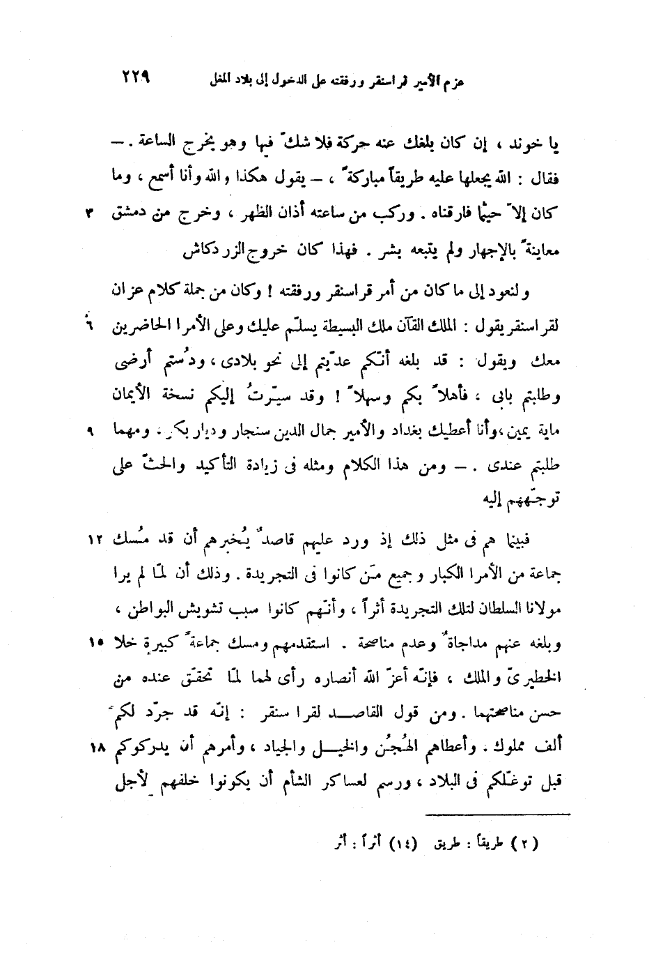 ولنعود إلى ما كان من أمر قراسنقر ورفقته! وكان من جملة كلام عزان لقراسنقر يقول: الملك القآن ملك البسيطة يسلّم عليك وعلى الأمرا الحاضرين معك ويقول: قد بلغه أنّكم عدّيتم إلى نحو بلادى، ودستم أرضى وطلبتم بابى، فأهلا بكم وسهلا! وقد سيّرت إليكم نسخة الأيمان ماية يمين، وأنا أعطيك بغداد والأمير جمال الدين سنجار وديار بكر، ومهما طلبتم عندى. -ومن هذا الكلام ومثله فى زيادة التأكيد والحثّ على توجّههم إليه