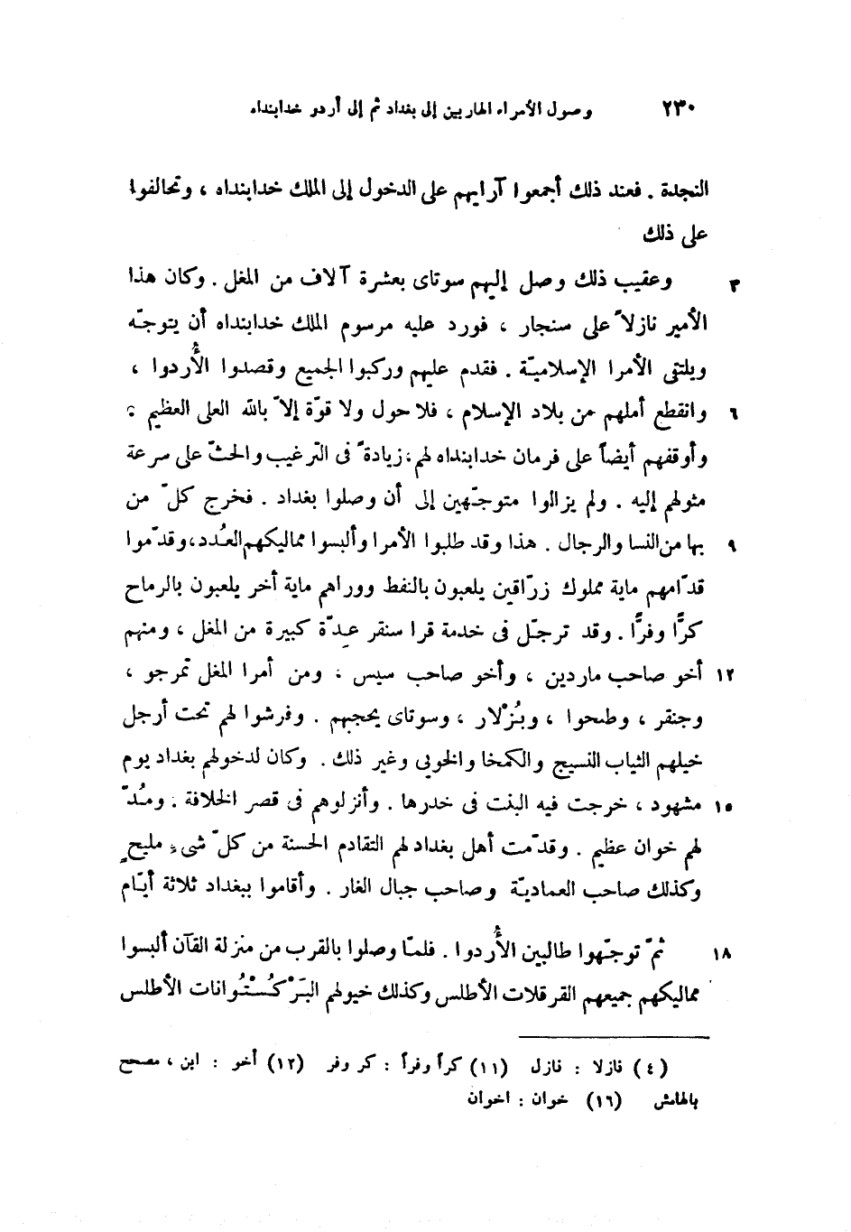 وعقيب ذلك وصل إليهم سوتاى بعشرة آلاف من المغل. وكان هذا الأمير نازلا (4) على سنجار، فورد عليه مرسوم الملك خدابنداه أن يتوجّه ويلتقى الأمرا الإسلاميّة. فقدم عليهم وركبوا الجميع وقصدوا الأردوا، وانقطع أملهم من بلاد الإسلام، فلا حول ولا قوّة إلاّ بالله العلى العظيم، وأوقفهم أيضا على فرمان خدابنداه لهم، زيادة فى الترغيب والحثّ على سرعة مثولهم إليه. ولم يزالوا متوجّهين إلى أن وصلوا بغداد. فخرج كلّ من بها من النسا والرجال. هذا وقد طلبوا الأمرا وألبسوا مماليكهم العدد، وقدّموا قدّامهم ماية مملوك زرّاقين يلعبون بالنفط ووراهم ماية أخر يلعبون بالرماح كرّا وفرّا (11). وقد ترجّل فى خدمة قراسنقر عدّة كبيرة من المغل، ومنهم أخو (12) صاحب ماردين، وأخو صاحب سيس، ومن أمرا المغل تمرجو، وجنقر، وطحوا، وبزلار، وسوتاى يحجبهم. وفرشوا لهم تحت أرجل خيلهم الثياب النسيج والكمخا والخويى وغير ذلك. وكان لدخولهم بغداد يوم مشهود، خرجت فيه البنت فى خدرها. وأنزلوهم فى قصر الخلافة. ومدّ لهم خوان (16) عظيم. وقدّمت أهل بغداد لهم التقادم الحسنة من كلّ شئ مليح وكذلك صاحب العماديّة وصاحب جبال الغار. وأقاموا ببغداد ثلاثة أيّام